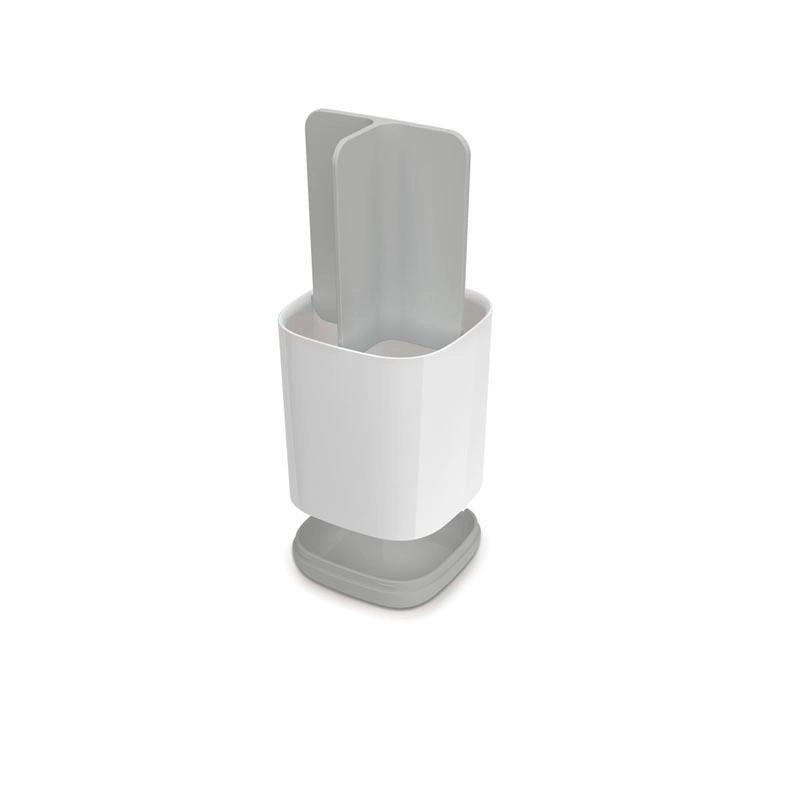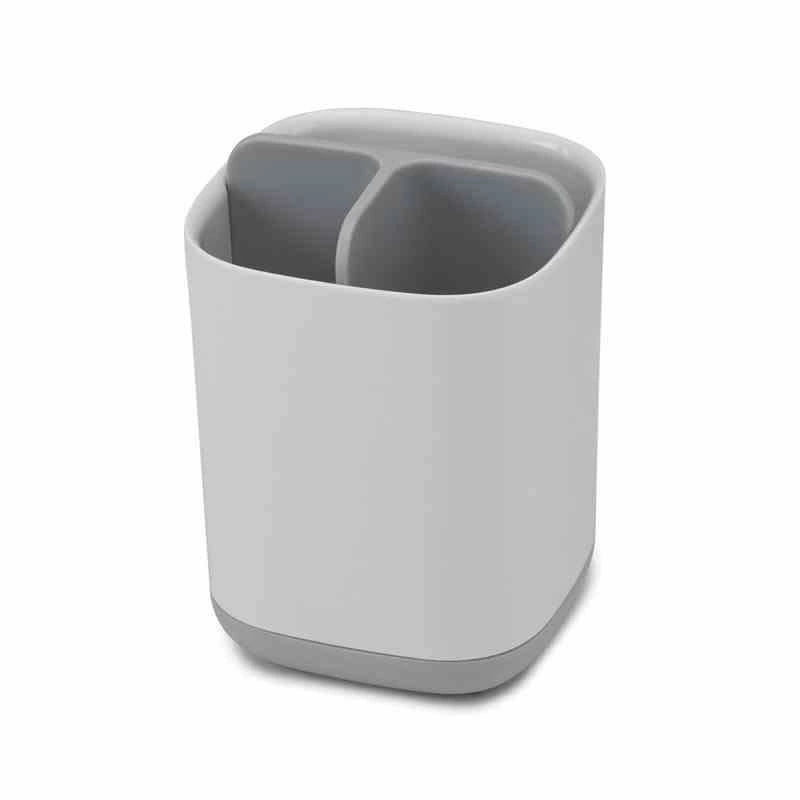 Kelímek na kartáčky Joseph Joseph JJ má promyšlenou konstrukci, která umožňuje pohodlné oddělení kartáčků a pasty. Protiskluzová základna zajišťuje stabilitu i na mokrém povrchu umyvadla. Použitý plast je odolný vůči vlhkosti a nečistotám, takže se kelímek snadno udržuje v čistotě. Otevřený tvar umožňuje rychlé schnutí kartáčků a přispívá tak k hygieně celé rodiny.