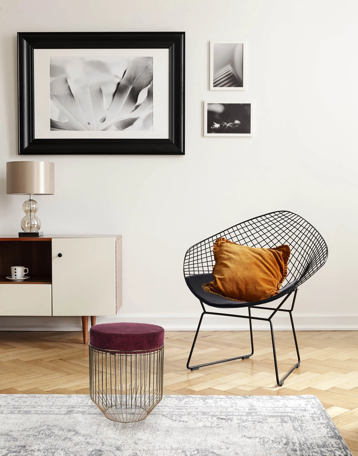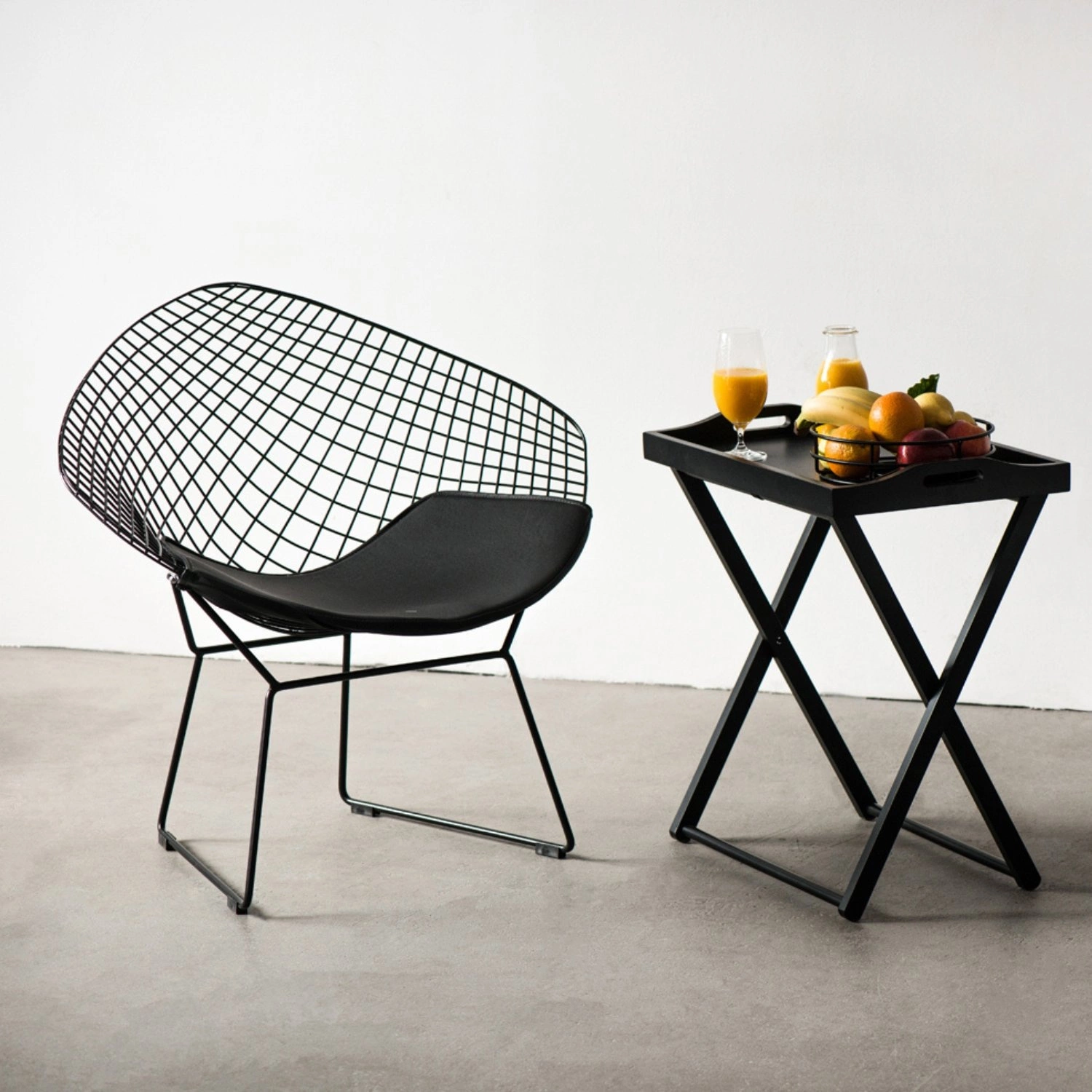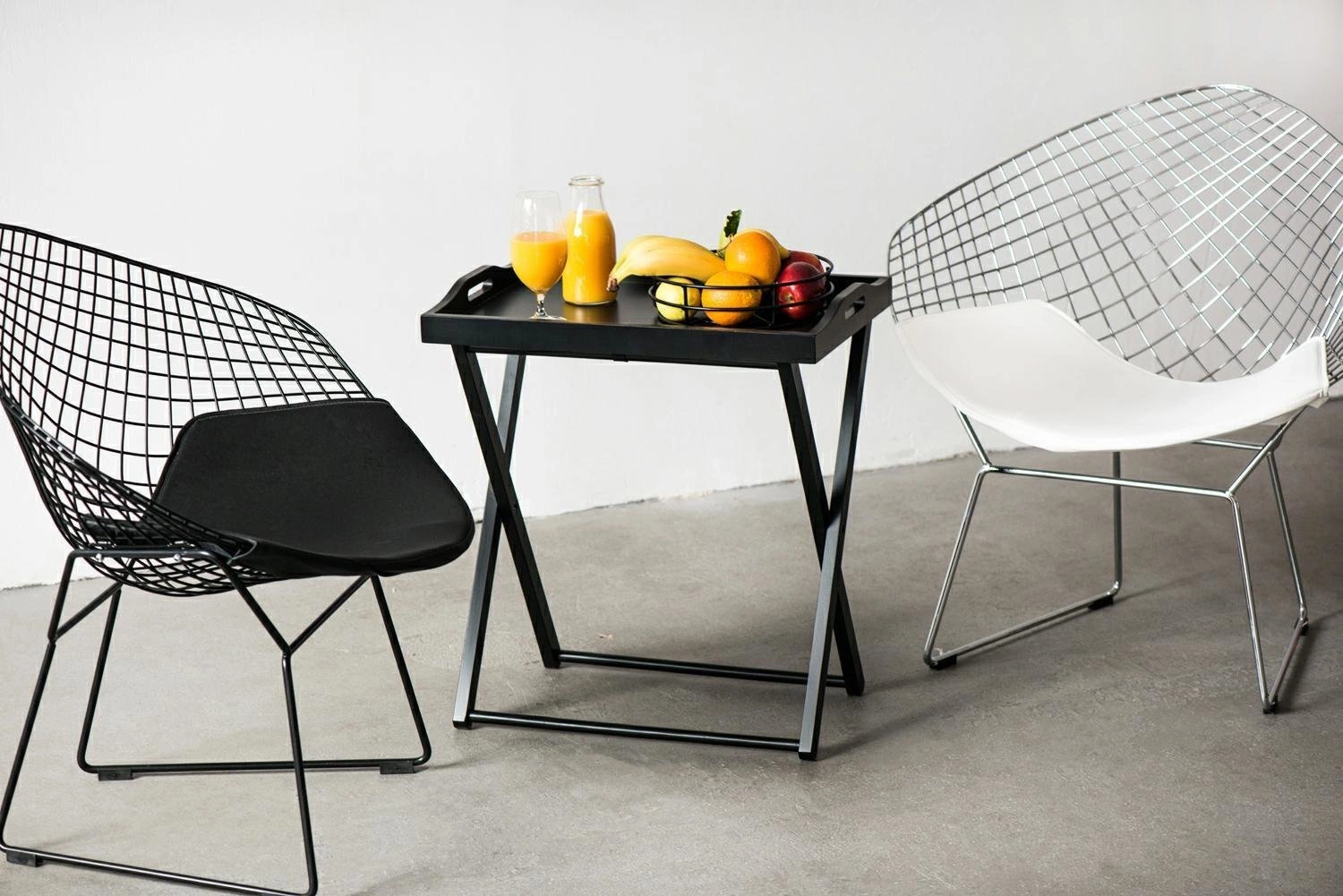 Designová židle HarryArm svou originální formou ohromuje jíž více než 60 let. Díky aerodynamickému tvaru židle vypadá lehce. Vyrobeno z černě lakovaného kovu s lesklým povrchem. Sedák je vyroben z matné eko-kůže. Polštář je připevněn k sedáku pomocí suchých zipů. Židle má loketní opěrky.