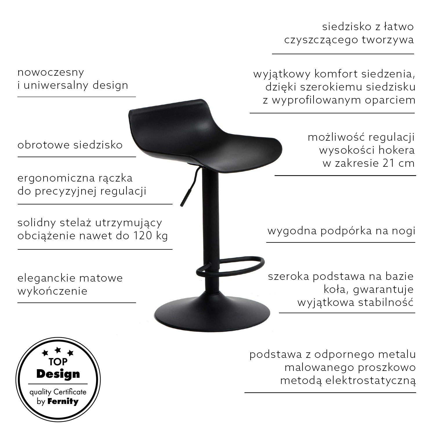 Hoker s nastavitelnou výškou Simplet Bar One je moderní černá barová židle navržená pro náročné kuchyňské prostory a místnosti s ostrůvkem. Kombinuje matný povrch, odolnou kovovou základnu a pohodlné sedadlo z kvalitního plastu, které si můžete snadno přizpůsobit díky výškové regulaci a otočné funkci. Tento model vyniká univerzálním designem a vysokou praktičností, nabízí komfortní používání jak v domácí kuchyni, tak v moderním baru.