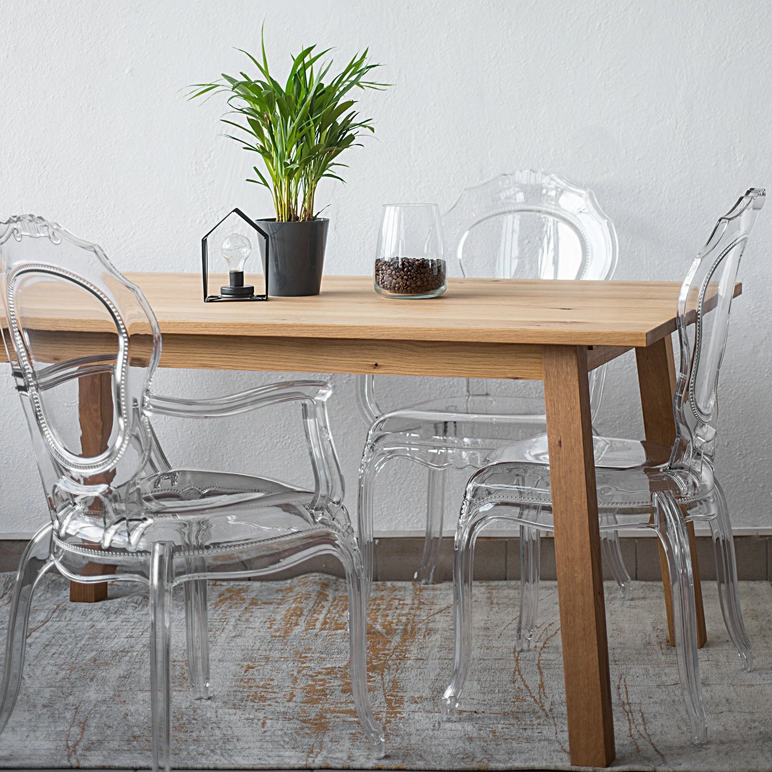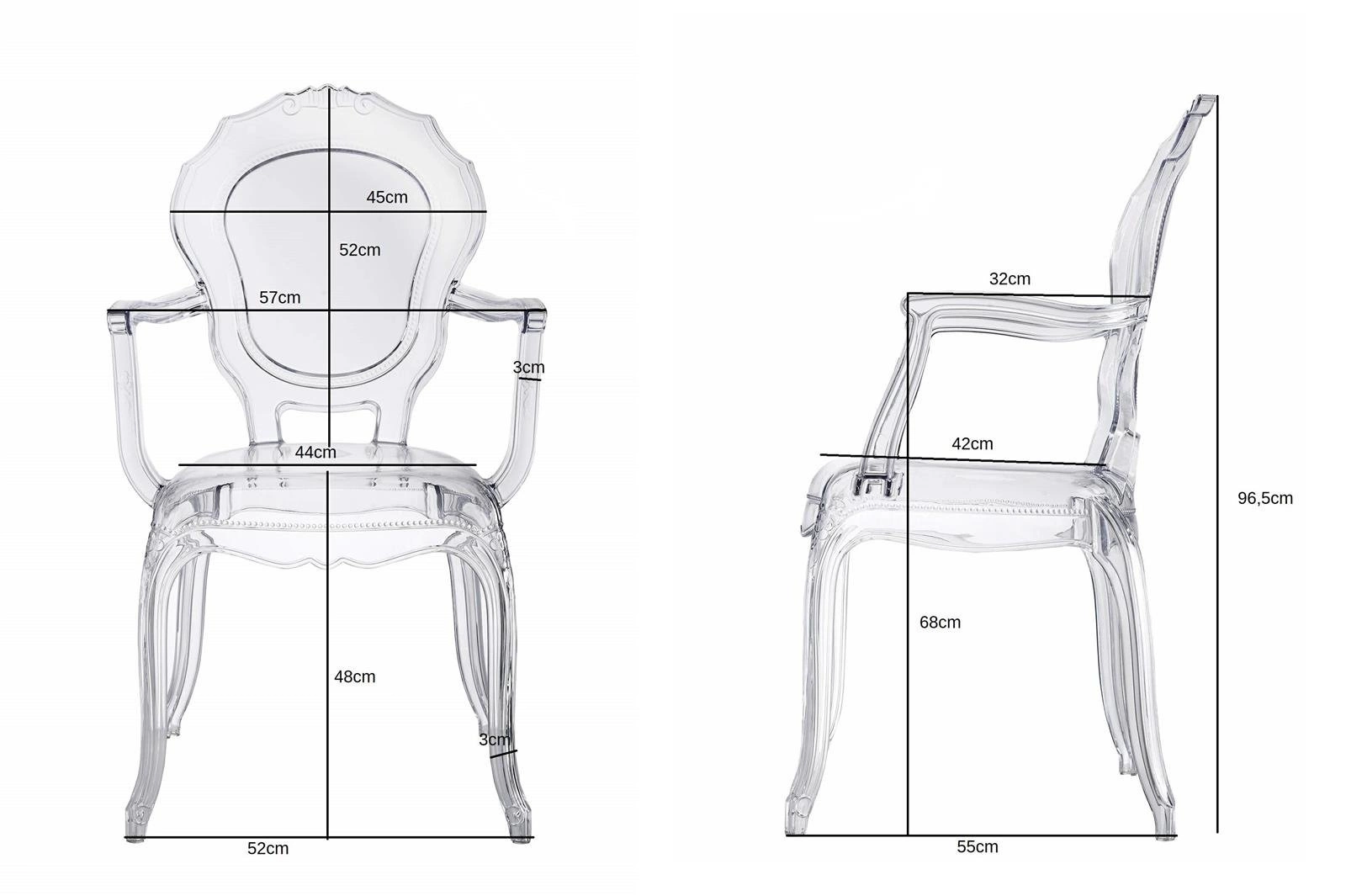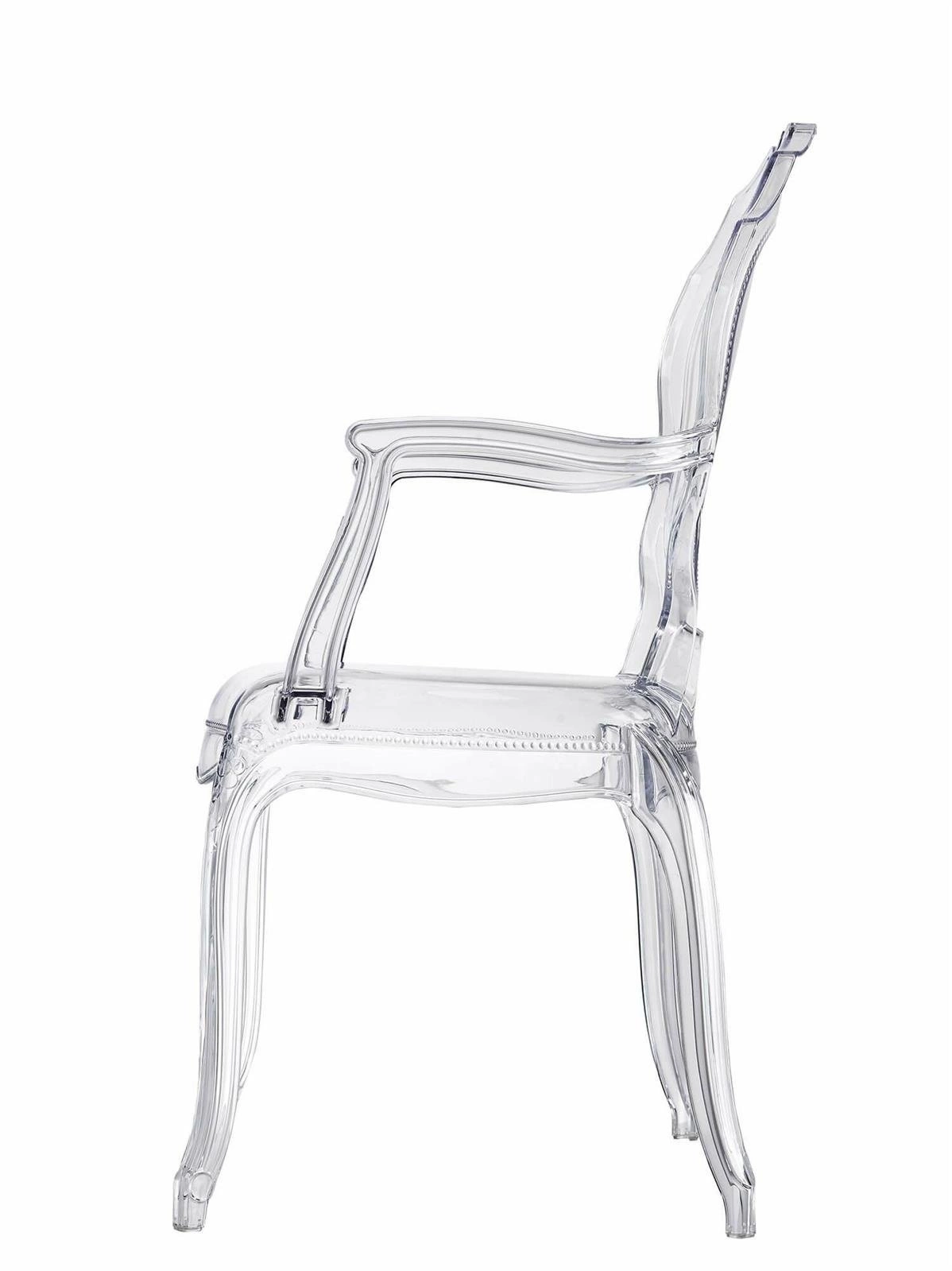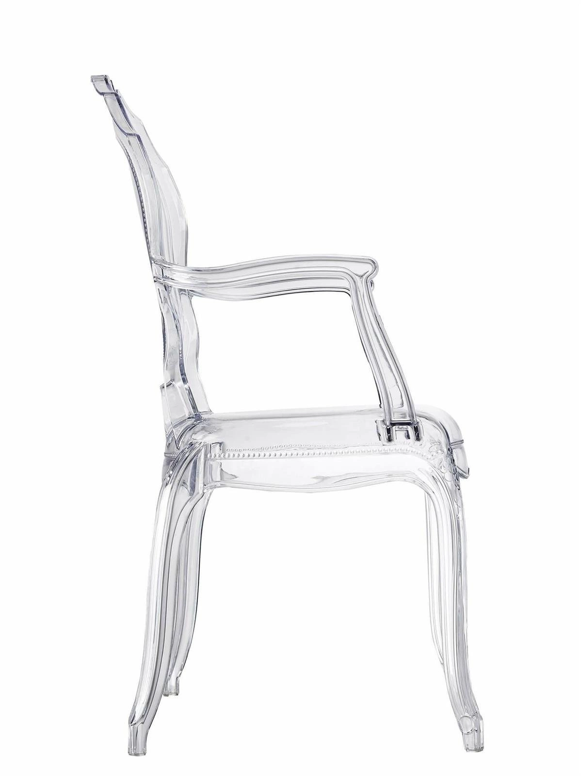 Design židle Queen Arm je inspirován klasickým ludvíkovským stylem, což se odráží v dekorativních detailech i charakteristických liniích opěradla a nohou. Průhledný plast dodává nábytku lehkost a originalitu, díky čemuž se židle skvěle hodí do moderních glamour interiérů. Transparentní provedení opticky zvětšuje prostor a propůjčuje i menším místnostem vzdušnost a elegantní vzhled.