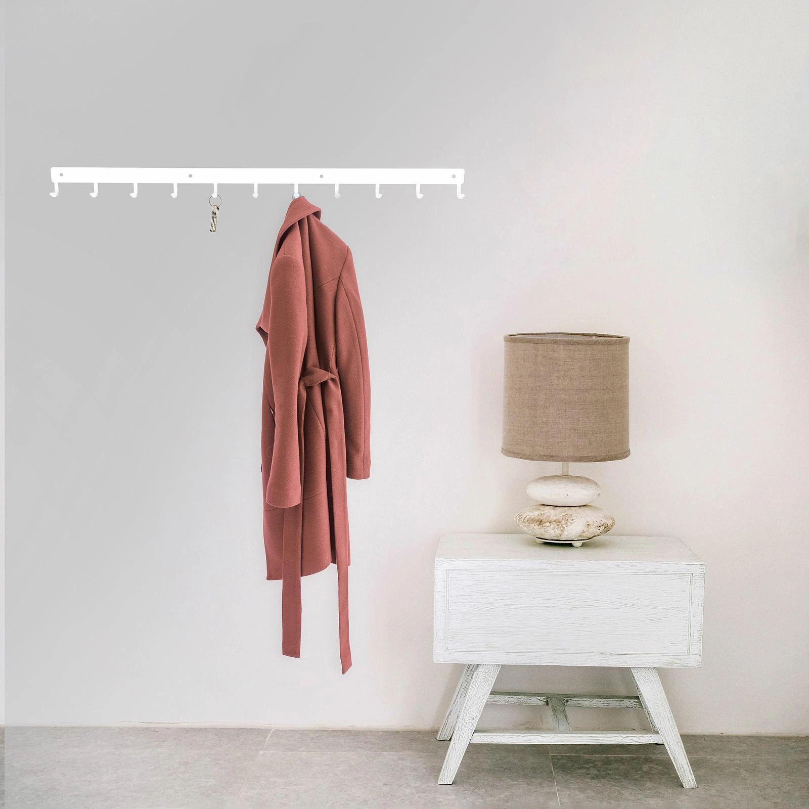 Lišta s háčky je ideálním řešením pro chodbu nebo čekárnu. Tento moderní ocelový věšák má až 11 háčků s maximálním zatížením 3 kg. Díky laserem vyřezávaným, ale odolným háčkům je lišta ideální pro odkládání kabelek, klíčů nebo oblečení. Výrobek je práškově lakovaný, takže se snadno čistí a je odolný proti poškrábání. Další výhodou je matný povrch, který dodává styl a eleganci. Lišta s háčky je k dispozici ve dvou barvách, díky čemuž máme více možností uspořádání interiéru. Maximální zatížení lišty je 33 kg. Věšák se dodává s montážní sadou, která se skládá z hmoždinek, hmoždinek a šroubů. Výška: 5,5 cm Šířka: 80 cm.