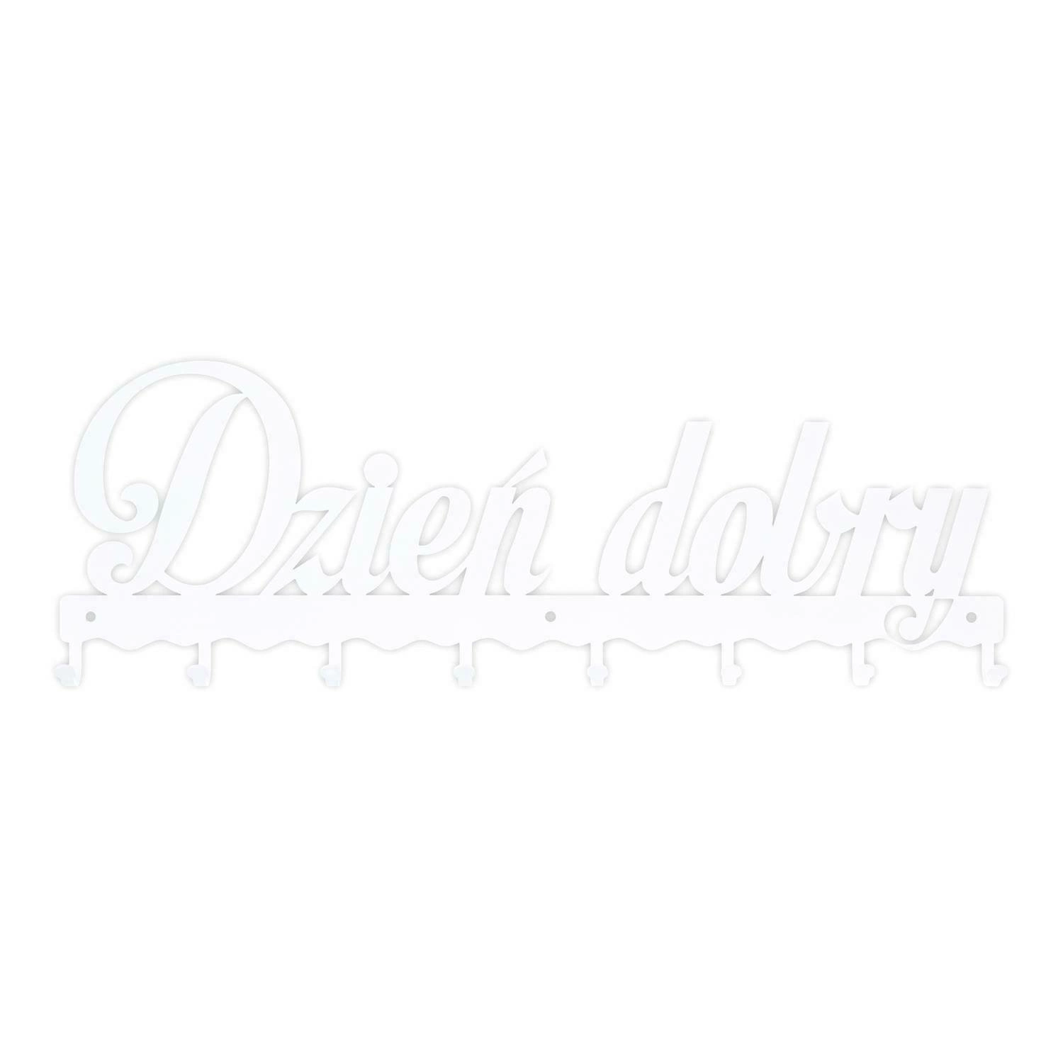 Nástěnný věšák do předsíně Dzień Dobry 01 bílý kovový od značky Intesi je praktickým a stylovým řešením, které vám pomůže udržet pořádek v každém moderním interiéru. Vyrobený z odolného kovu, věšák o šířce 60 cm a výšce 21 cm nabízí až 8 háčků, na které pohodlně zavěsíte bundy, kabáty, kabelky nebo klíče. Univerzální bílá barva a originální nápis „Dzień Dobry“ vnesou do vaší předsíně pozitivní energii a dodají jí přívětivou atmosféru.