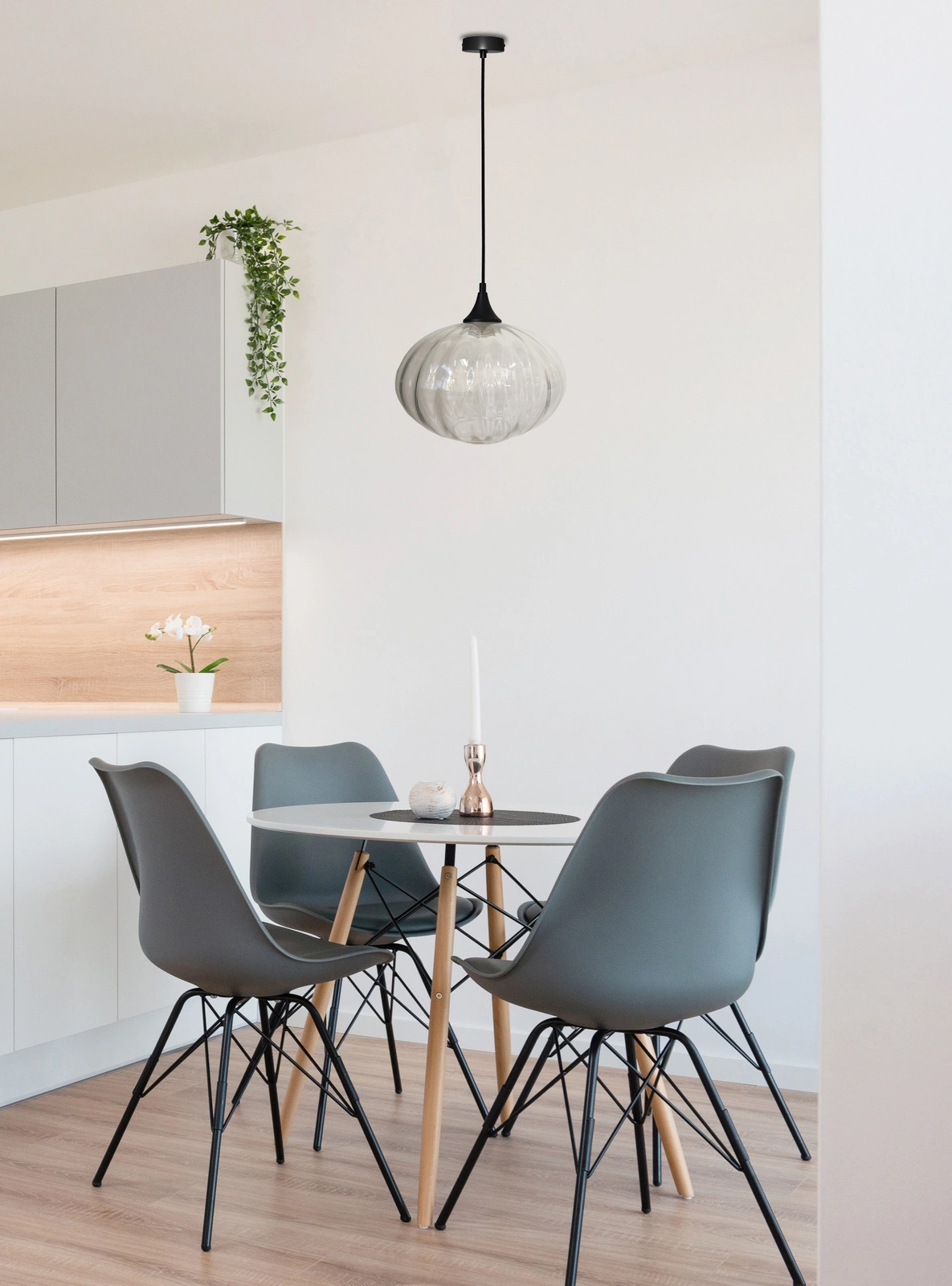 Rodina tří klasických závěsných svítidel z černého kovu s rýhovaným skleněným stínidlem. Svítidla jsou k dispozici ve třech velikostech stínidel. Výrobky této rodiny jsou ideální pro místnosti, jako je obývací pokoj, jídelna, kuchyně, ložnice, pracovna