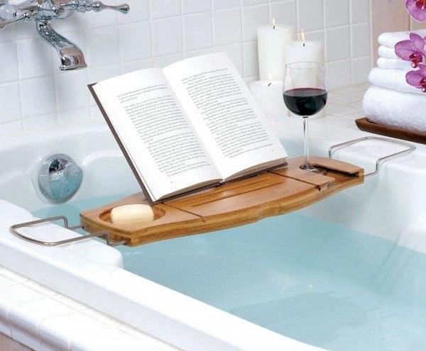 Poličku lze umístit na vanu pomocí speciálních držáků. Má speciální místo pro sklenici a poličku na knihy. Navíc je zde místo pro mýdlo.
