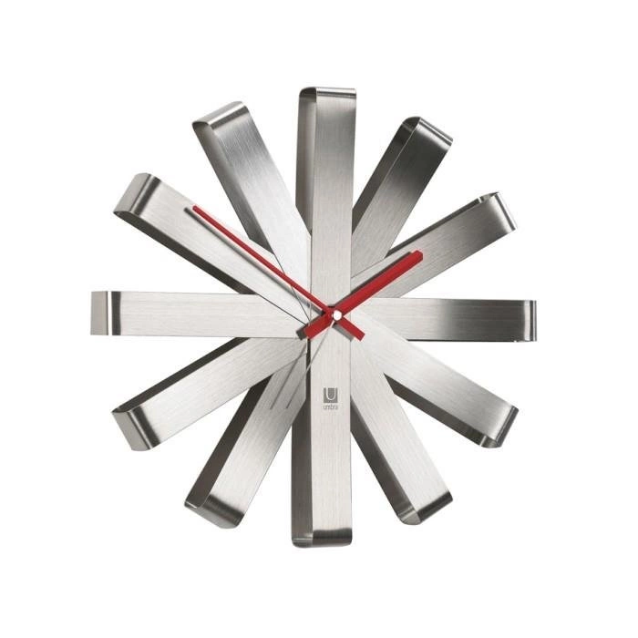 Nástěnné hodiny Umbra Ribbon okouzlí moderním vzhledem – kovové „stuhy“ tvoří dynamický, trojrozměrný ciferník. Chromovaný povrch krásně odráží světlo, což interiéru dodává eleganci a vzdušnost. Tyto moderní hodiny se skvěle hodí do minimalistických, industriálních i loftových prostorů a stávají se originálním prvkem na stěně. Kvalitní ocel zaručuje odolnost a dlouhou životnost, takže vám budou dělat radost po mnoho let.