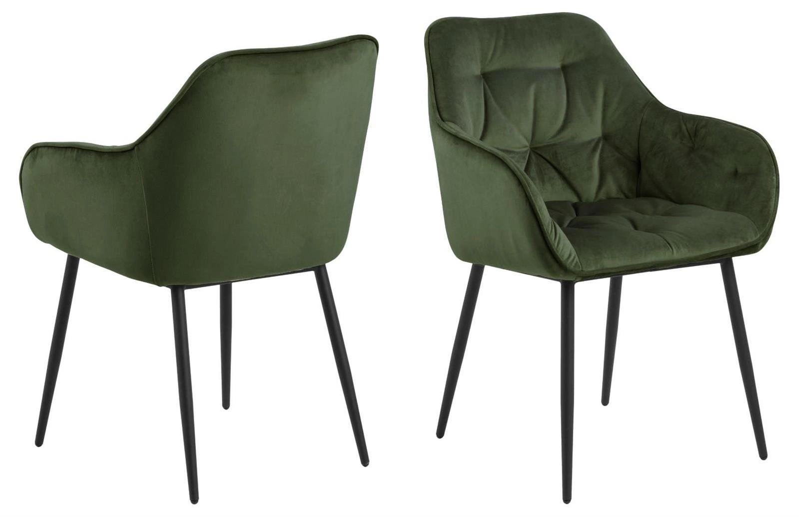 Židle Sorell Forest Velvet od značky Actona je elegantní zelená sametová židle s područkami a matně černými nohami, ideální do obývacího pokoje, jídelny nebo k toaletnímu stolku. Čalounění z měkké látky VIC v odstínu forest green zaujme prošívaným opěradlem ve tvaru mušle a stabilní kovovou konstrukcí. Pohodlný sedák o šířce 55 cm a výšce 47 cm spolu s maximální nosností 120 kg zaručují spolehlivou volbu pro každodenní použití.