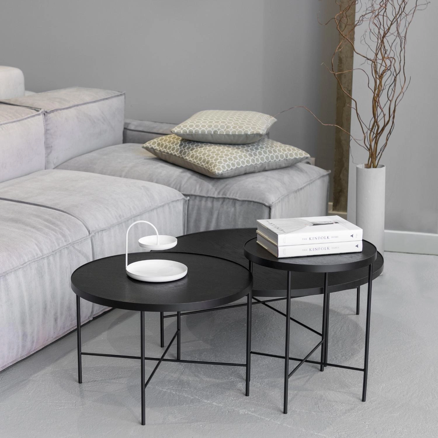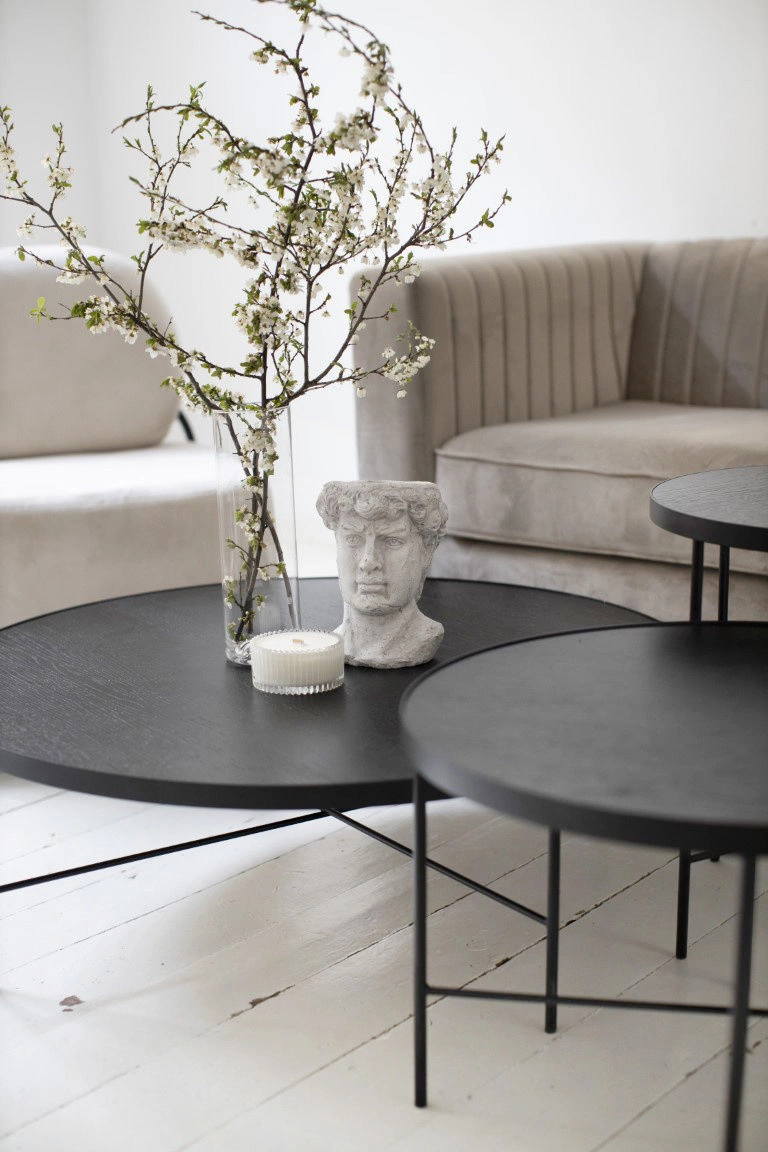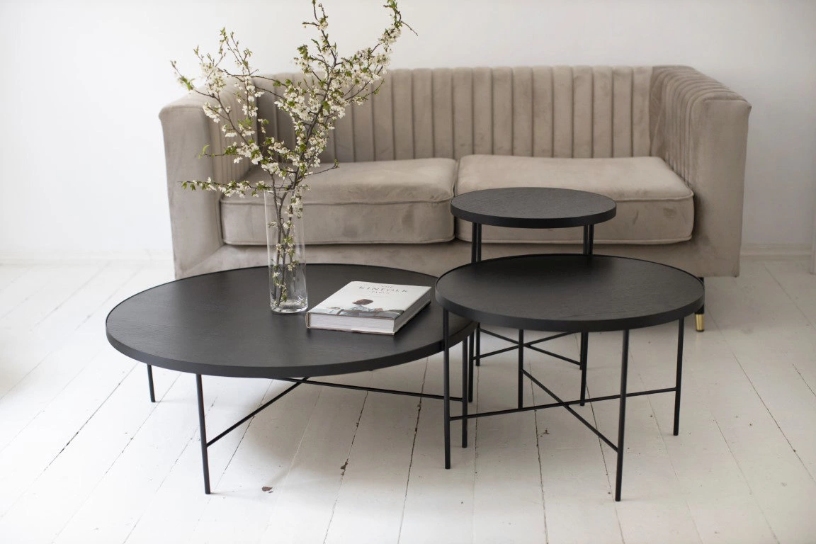 Kulatý konferenční stolek Tre 90 cm černý dubový moderní do obývacího pokoje NORDIFRA je působivý, moderní konferenční stolek, který spojuje eleganci černého dřeva s industriálními kovovými prvky. Kulatá deska o průměru 90 cm je vyrobena z přírodního dubového dřeva, zatímco stabilní podnož tvoří kov s hlubokým matným černým lakováním. Stolek je určený do obývacího pokoje a skvěle doplní moderní, loftové i industriální interiéry.