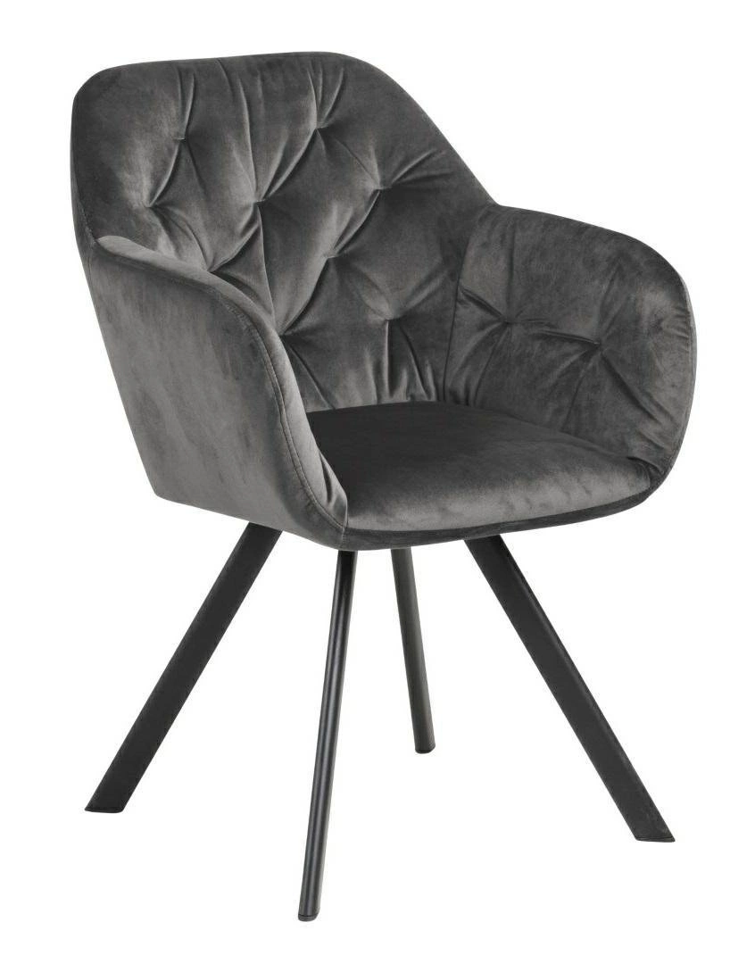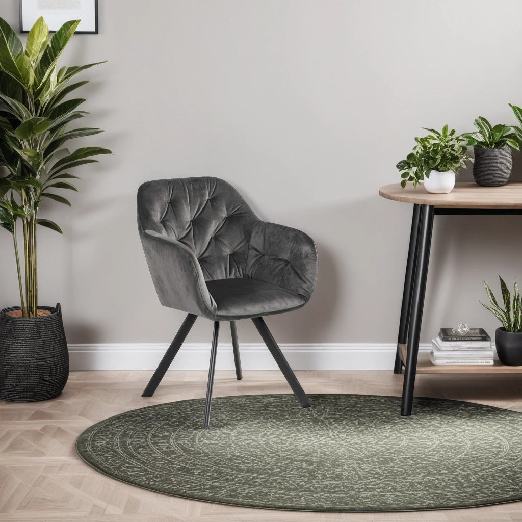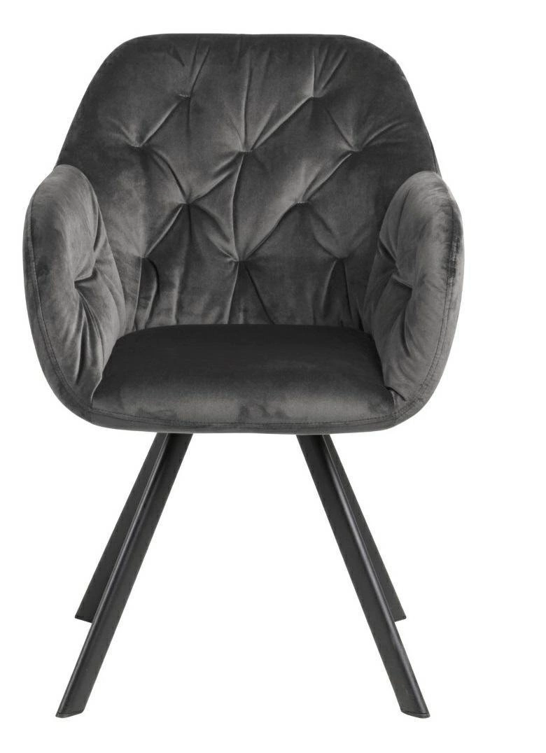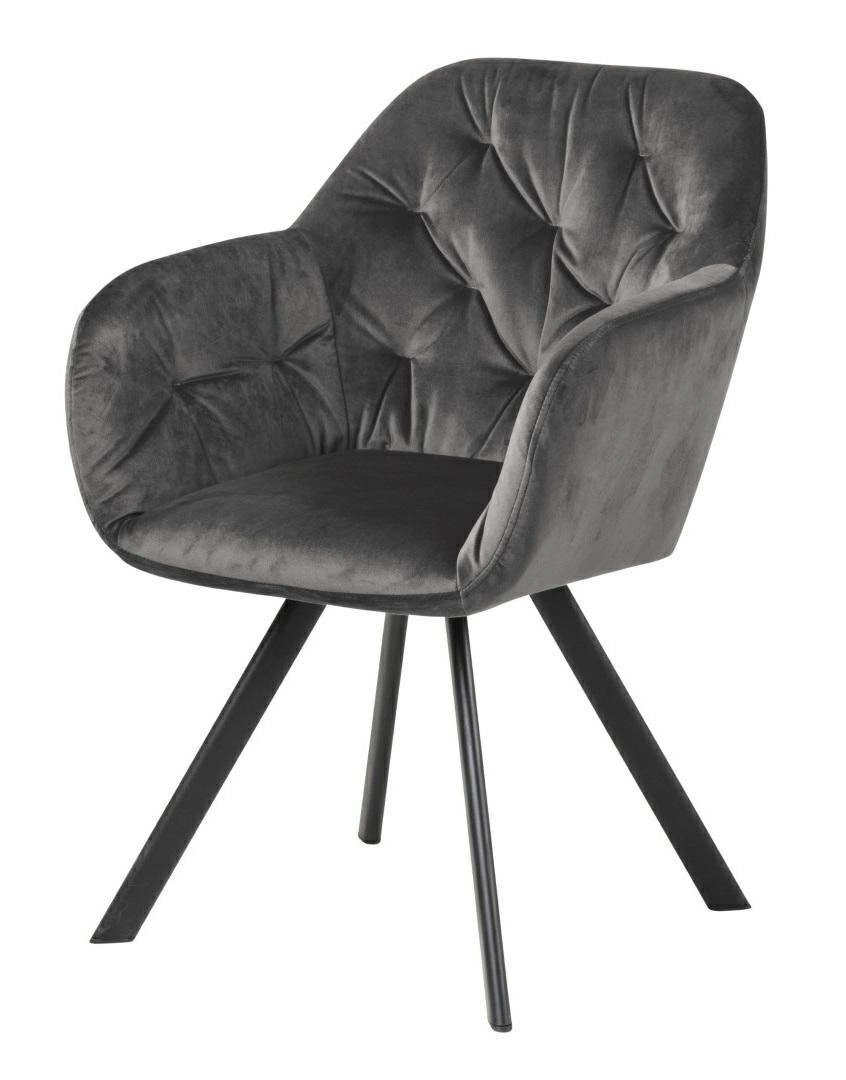 Čalouněná židle Lola VIC od značky Actona je ztělesněním moderního glamour stylu v nadčasovém provedení. Tento model zaujme měkkým, sametovým potahem v tmavě šedém odstínu, komfortní skořepinovou konstrukcí s područkami a stabilní, matnou podnoží z černého kovu. Díky šířce 57,5 cm, hloubce 61,5 cm a otočné funkci se samonávratem poskytuje nadstandardní pohodlí jak v jídelně, tak u toaletního stolku nebo v domácí pracovně.