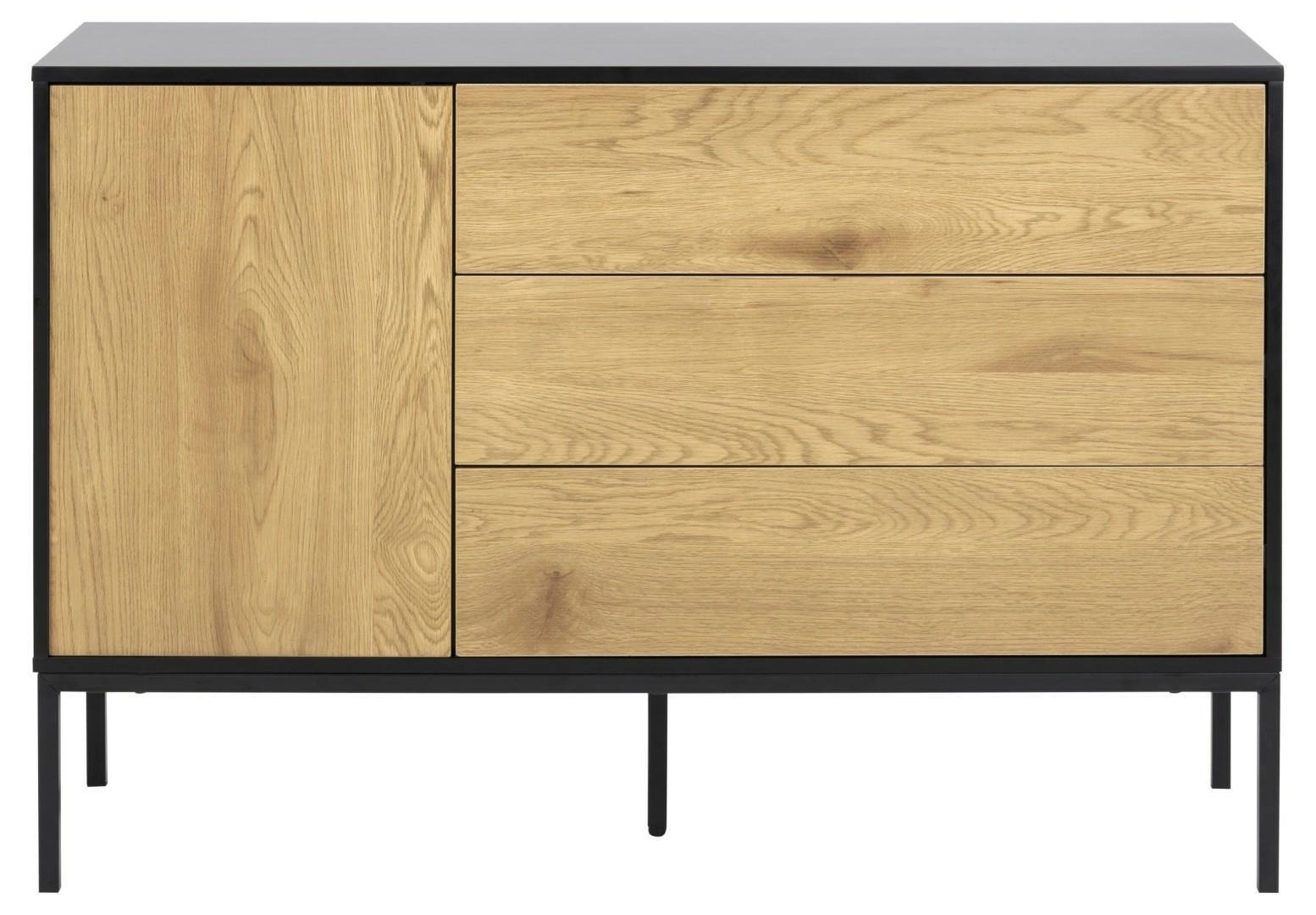 Komoda Seaford od Actona spojuje černou, štíhlou konstrukci s přírodní dubovou úpravou. Taková barevná kombinace se perfektně hodí do loftových, moderních i skandinávských interiérů, kde dodá místnosti jedinečný charakter a vzdušnost. Výška 82 cm umožňuje využít komodu také jako TV stolek, vytvořit praktickou multimediální zónu v obývacím pokoji nebo prostornou plochu pro vystavení oblíbených dekorací a rostlin.