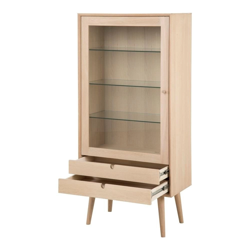 Vitrína Century z běleného dubu je nepostradatelným kusem nábytku do kanceláře nebo pracovny. Prostorná vitrína byla vyrobena z běleného dubu a skla. Skříňka s proskleným čelem ukrývá tři skleněné police. Pod skříňkou jsou navíc dvě zásuvky s čely z dubového dřeva. Na čelech jsou jemné vroubky, které slouží jako úchyty pro otevírání zásuvek. Základem skříně jsou čtyři dubové nohy ve tvaru obrácených kuželů. Hmotnost: 43 kg.