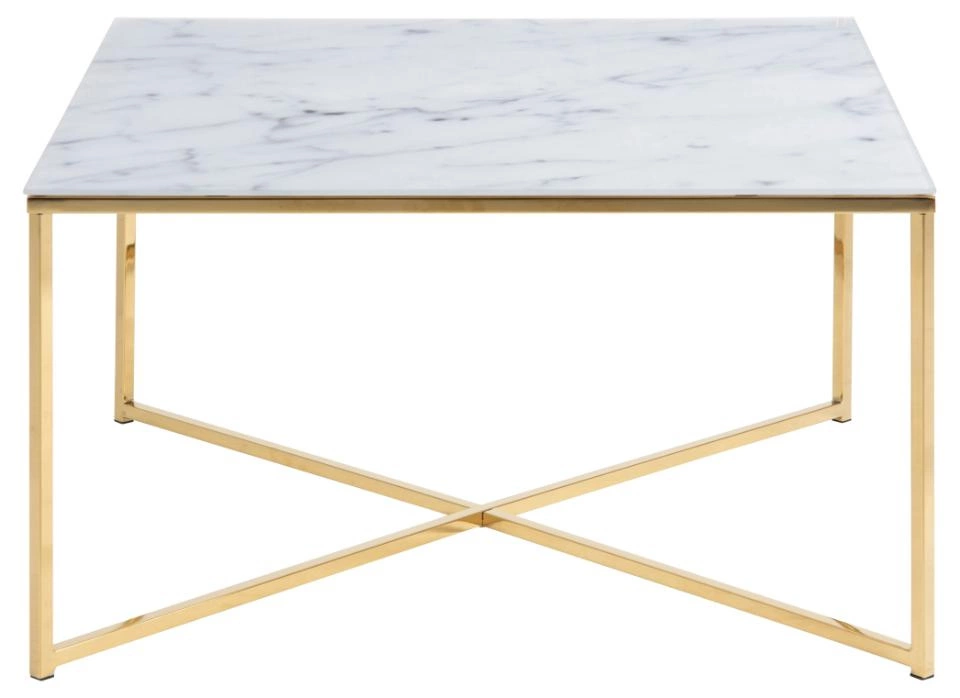 Konferenční stolek Alisma je stolek v glamour stylu. Kovový chromovaný podstavec ve zlaté barvě mu dodává na lesku. Stůl je zakončen deskou z mléčného skla s potiskem imitujícím bílý mramor. Tloušťka horní části je 6 mm. Hmotnost: 12,51 kg.