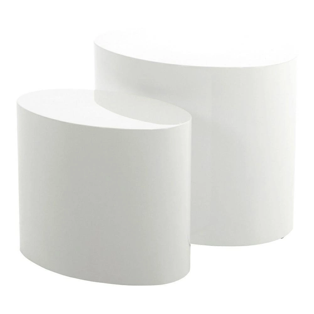 Sada dvou bílých stolků v imitaci pařezu je dekorací ve stylu glamour. Oválné stoly jsou vyrobeny z plastu a lesklé dýhy v bílé barvě. Sada se skládá ze dvou stolů. Rozměry: 33 cm x 48 cm x 40 cm 24,5 cm x40 cm x33 cm Hmotnost: 8 kg