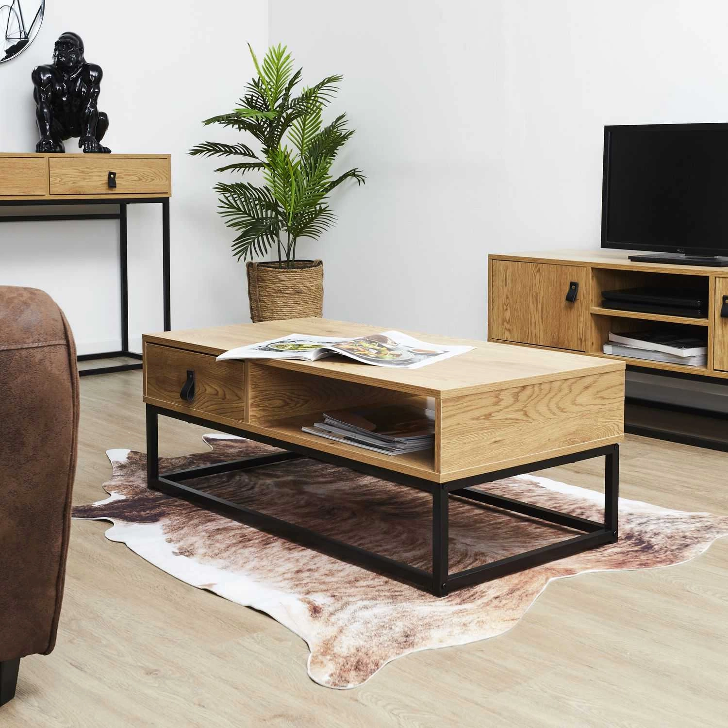 Stolek na kávu Abbott obdélníkový dubový s policí a zásuvkou skandinávský do obýváku od značky Intesi je spojením funkčnosti, moderního designu a praktických řešení pro váš interiér. Tento obdélníkový konferenční stolek je vyroben z laminované desky v přírodní dubové barvě a stojí na pevné černé kovové konstrukci. Nabízí nejen místo na šálek kávy, ale také praktickou polici a prostornou zásuvku na drobnosti. Rozměry 100×50×36 cm zajišťují, že je to ideální stolek do skandinávského obývacího pokoje, který se hodí jak do menších, tak i větších prostor.