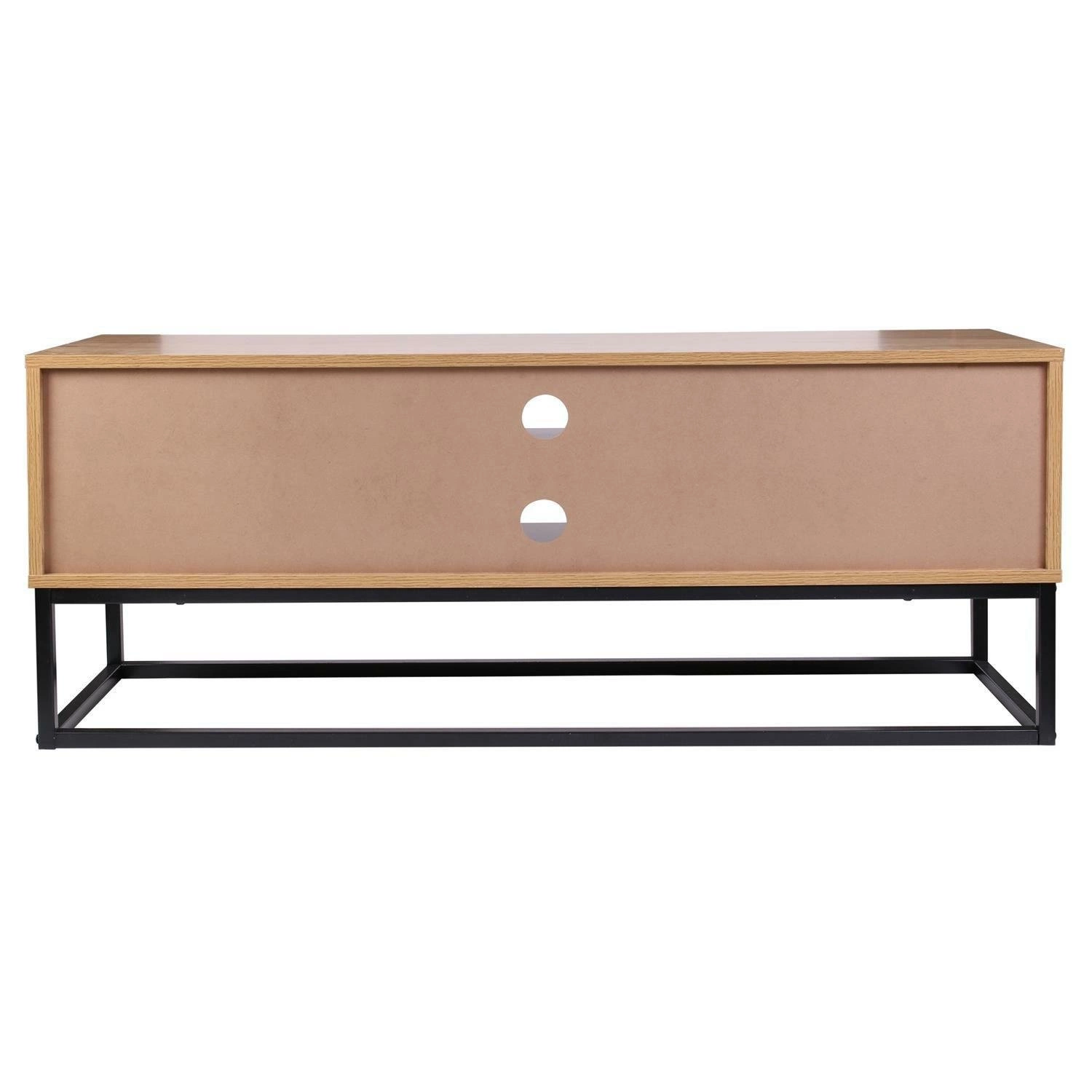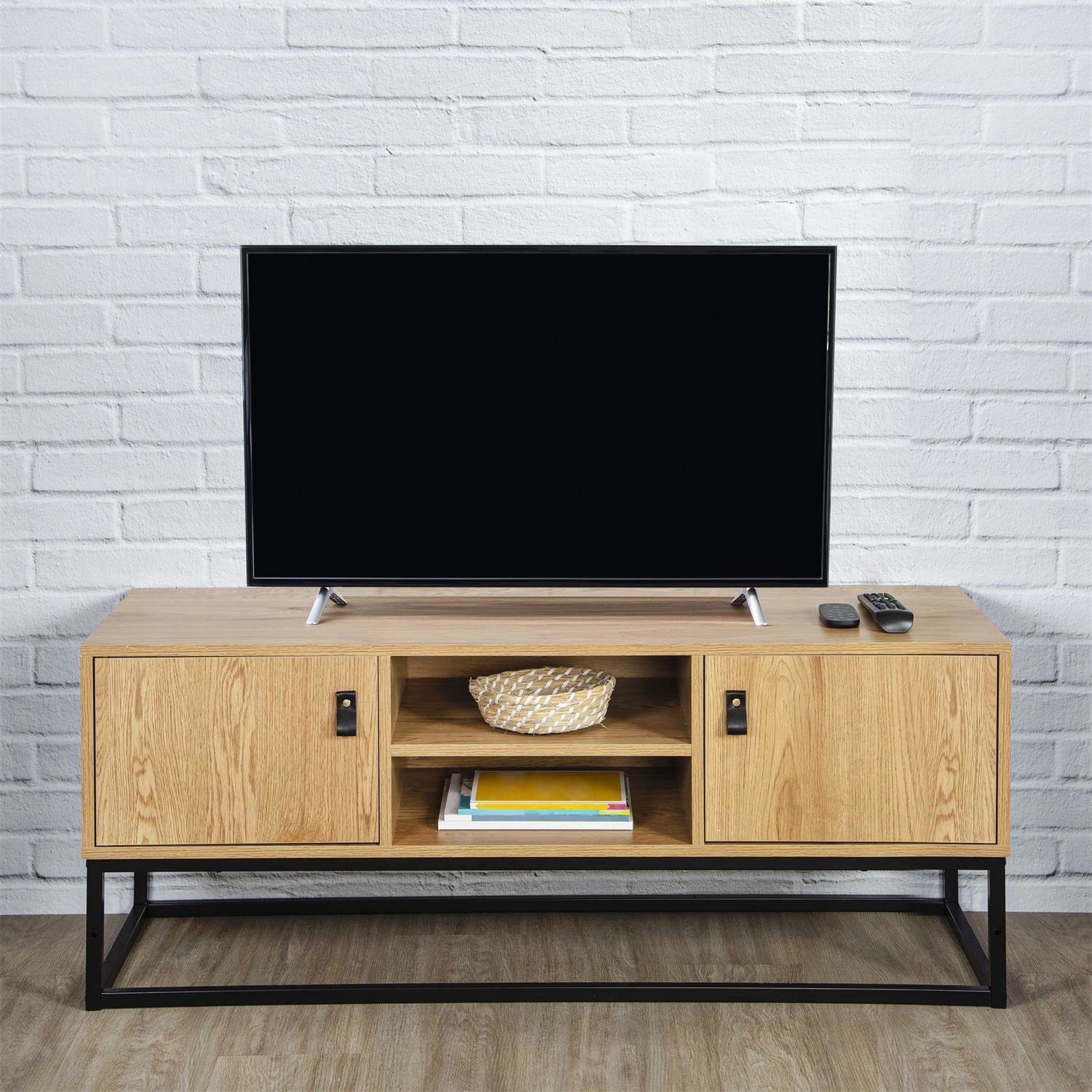Skříňka TV je nezbytným kusem nábytku v každém obývacím pokoji. Přestože je velmi tvarově výrazná, je mimořádně prostorná. Její malé rozměry umožňují uložit vše, co by mělo být v takové skříni po ruce. Skříň má dvě uzavřené skříňky s úchytkami z eko-kůže a dvě otevřené prostorné police. K dispozici je také hladká horní deska, která poskytuje další využitelný prostor. Místo tradičních nohou jsme použili černý kovový rám s práškovým nástřikem, na kterém nábytek pevně drží svou váhu. Skříň RTV byla vyrobena z velmi pevné laminované desky odolné proti intenzivnímu používání. Elegantní barva zlatého dubu s dekory imitujícími přirozenou barvu a kresbu dřeva je doplněna ocelovou konstrukcí v černé barvě. Hmotnost skříně: 21 kg