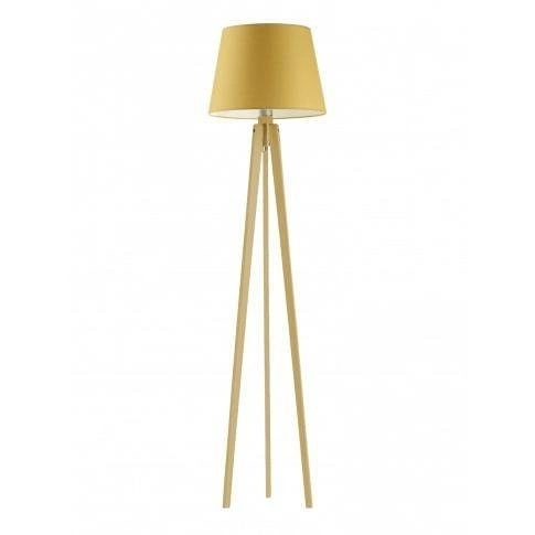 Stojací lampa Curacao do obýváku, moderní s hořčicovým stínidlem a dubovým trojnožkou