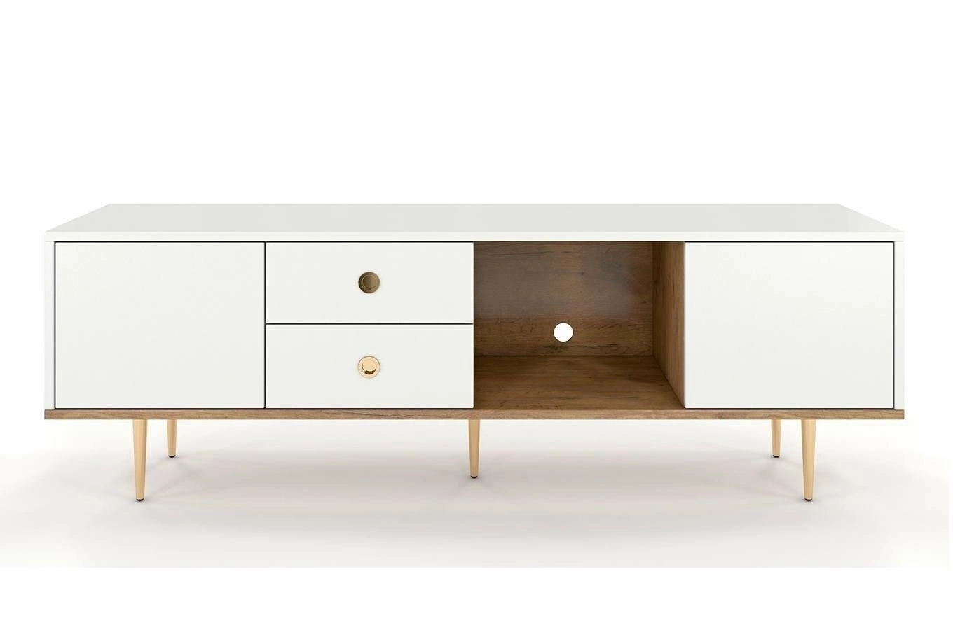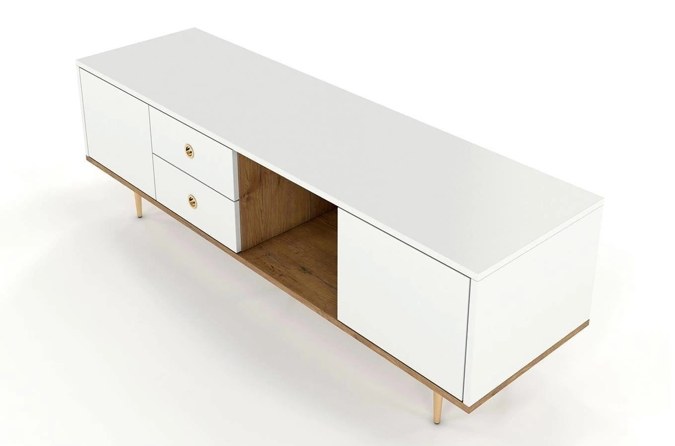 Skandinávská RTV skříňka Harmoni H02 zaujme jemným spojením bílého borovicového dřeva s výraznou zlatou podstavou. Jednoduchý tvar a hladké čelní plochy odrážejí myšlenku moderní elegance a vnášejí do obývacího pokoje pocit lehkosti a harmonie. Díky nadčasovým barvám se tento nábytek hodí jak do světlých, tak i kontrastních interiérů, kde opticky zvětší prostor.