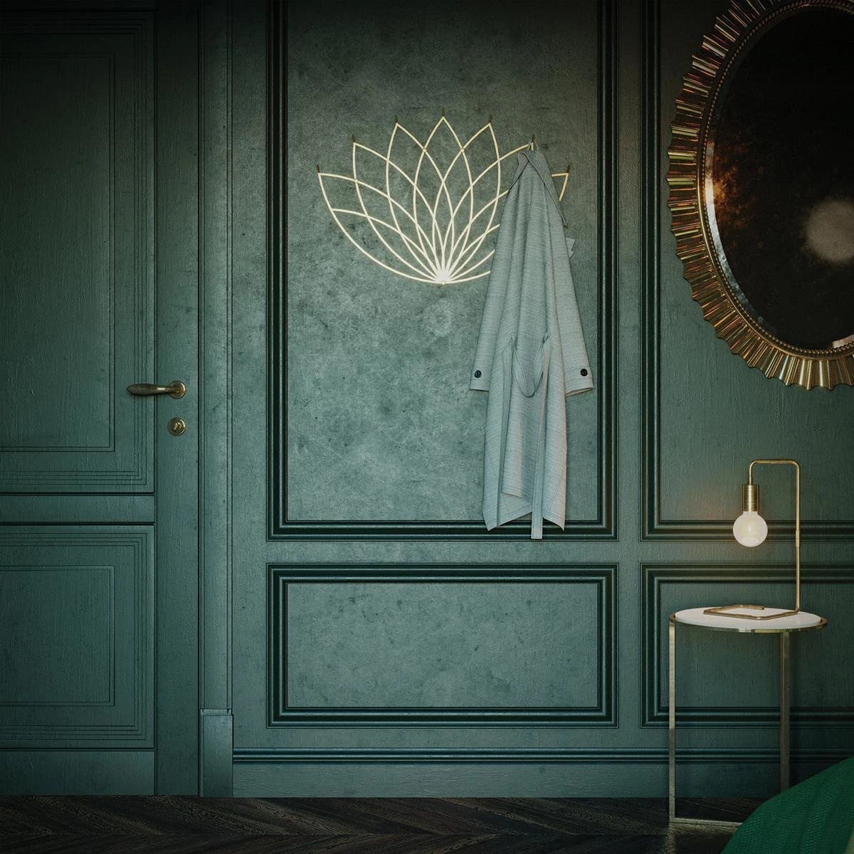Nástěnný věšák Lotos POLYHEDRA je mnohem víc než obyčejný věšák na bundy – představuje promyšlenou dekoraci do předsíně, která upoutá pozornost a podtrhne jedinečný styl vašeho domova. Jeho geometrický tvar inspirovaný motivem lotosového květu nabízí nejen místo pro odkládání věcí, ale také originální ozdobu stěny. Zlatá barva krásně odráží světlo, rozjasňuje prostor a dodává mu eleganci.