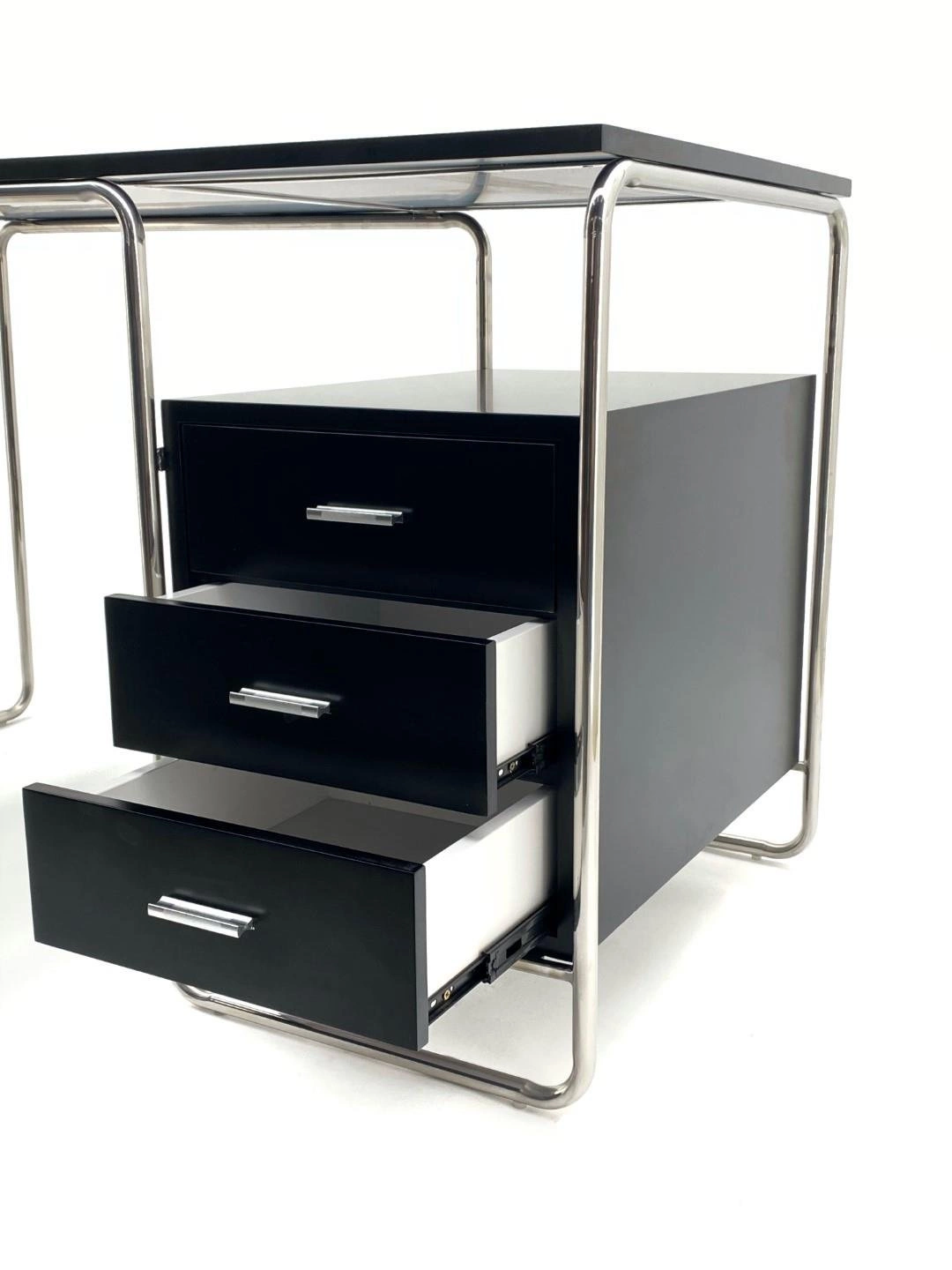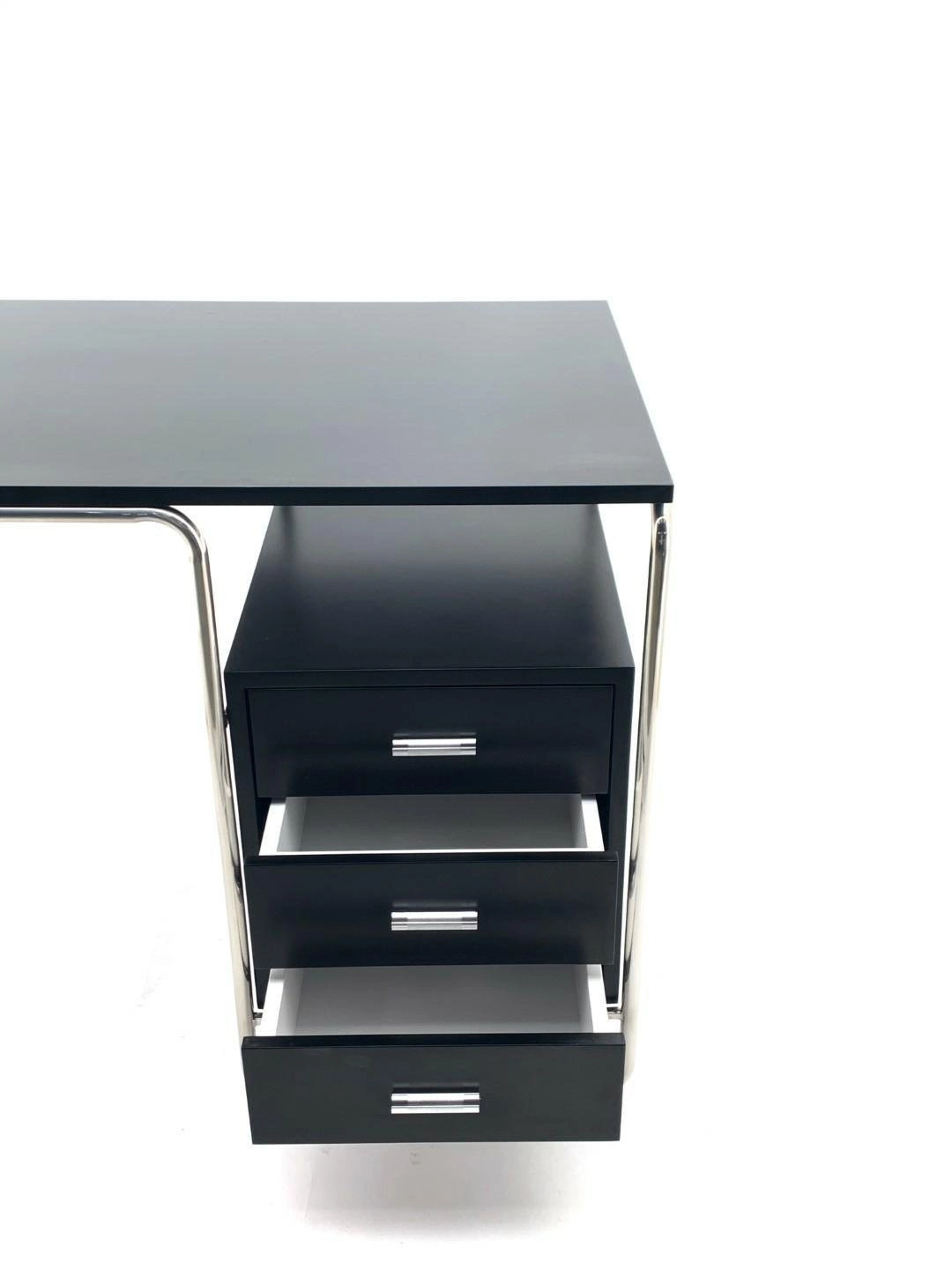 Moderní psací stůl Thon se skvěle hodí do minimalisticky zařízených interiérů, kde je důležitá nejen estetika, ale i funkčnost. Černé provedení desky a chromované nohy podtrhují industriální charakter nábytku a zároveň tvoří decentní pozadí pro designové doplňky nebo stolní lampu. Jednoduché, hladké čelo zásuvek a kovové úchyty dodávají celku mimořádně elegantní vzhled, který perfektně zapadne jak do domácí pracovny, tak do moderní kanceláře.