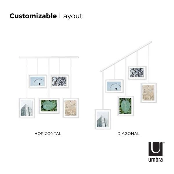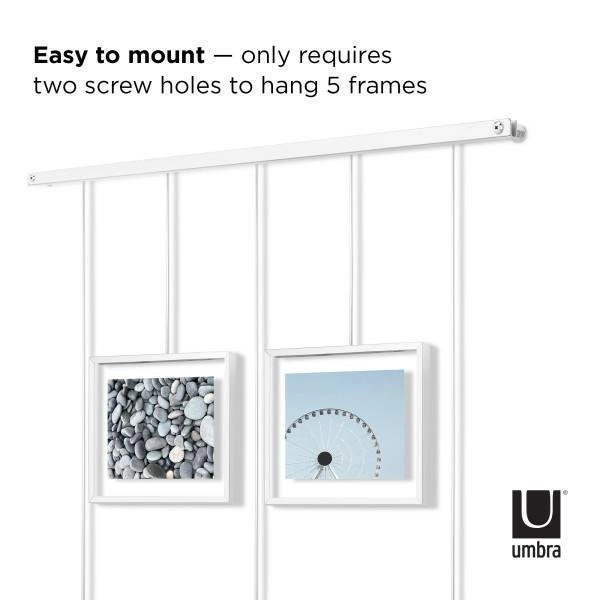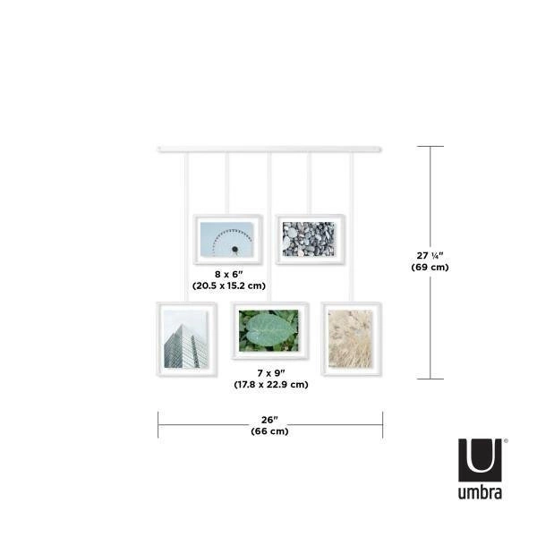 Multirámeček Umbra Exhibit je praktickým řešením, díky kterému snadno vytvoříte působivou galerii na zdi bez nutnosti vrtat více děr. Všech pět rámečků je zavěšeno na jedné kovové liště, což umožňuje jednoduchou změnu jejich uspořádání podle vaší představy o dekoraci. Rozměry celé sestavy – 69 cm na výšku a 66 cm na šířku – umožňují vystavit oblíbené rodinné fotografie, portréty dětí, vzpomínky z cest nebo inspirativní plakáty ve formátu 10x15 i 13x18 cm.