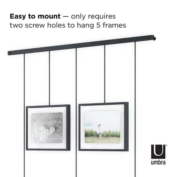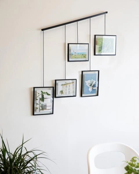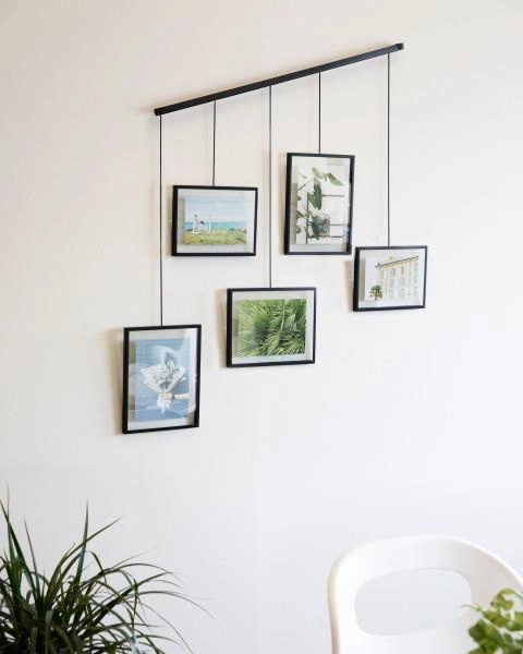 Toužíte po originální stěně plné vzpomínkových fotografií? Exhibit od značky Umbra vám umožní vytvořit vlastní galerii, která se stane srdcem obývacího pokoje, ložnice nebo domácí kanceláře. Díky unikátní kovové liště snadno zavěsíte pět snímků v různých velikostech bez nutnosti vrtání více otvorů do zdi. Černý rámeček na stěnu podtrhuje charakter industriálních a skandinávských interiérů, zatímco jeho minimalistický design zvýrazní to nejdůležitější na fotografiích – emoce a vzpomínky.