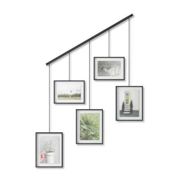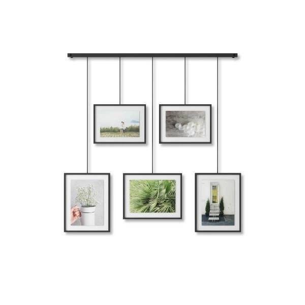 Visící fotorámeček multirámeček Exhibit Umbra je designovým řešením, které vám umožní stylově vystavit pět oblíbených fotografií ve formátech 10x15 cm a 13x18 cm. Je vyroben z kvalitního kovu v elegantní černé barvě, díky čemuž skvěle zapadne do moderního loftového interiéru. Exhibit je multirámeček, který nejen uspořádá vaše vzpomínky, ale také se stane výraznou dekorací stěny o působivých rozměrech 69×66 cm.