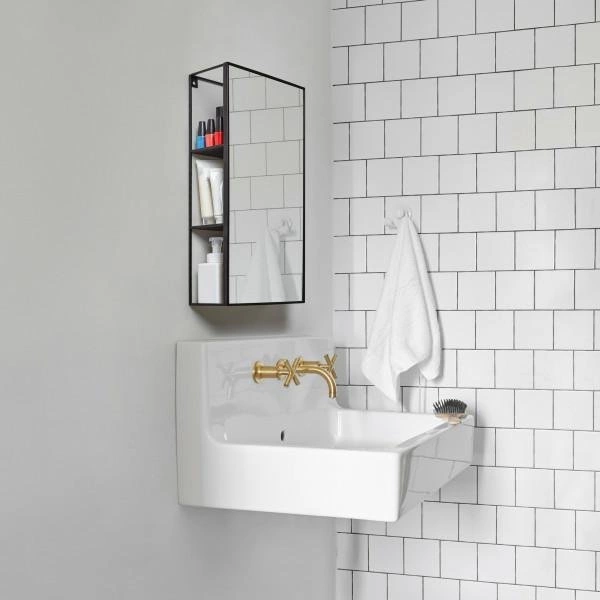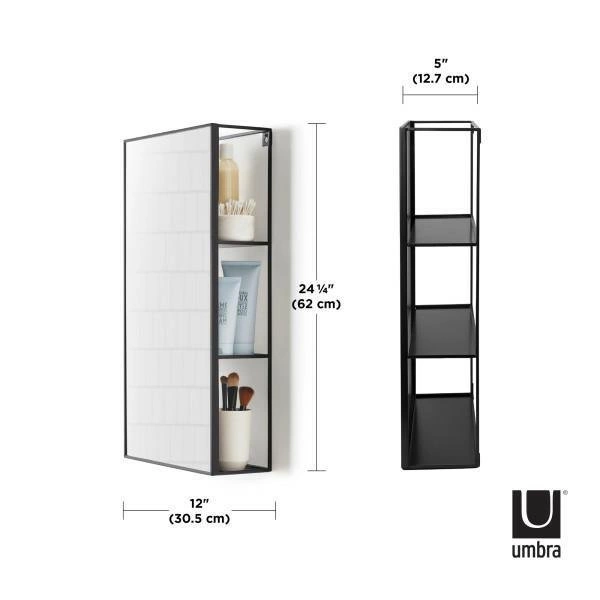 Závěsná koupelnová skříňka s zrcadlem Cubiko černá od značky Umbra je spojením nadčasové funkčnosti a moderního designu. Vyrobena z odolné oceli a skla, s rozměry 62×30×12,7 cm, je ideální jako praktická závěsná skříňka do moderních koupelen. Obdélníkové zrcadlo v černém rámu nejen opticky zvětší a prosvětlí prostor, ale také chytře ukryje poličky na všechny nezbytné koupelnové doplňky.