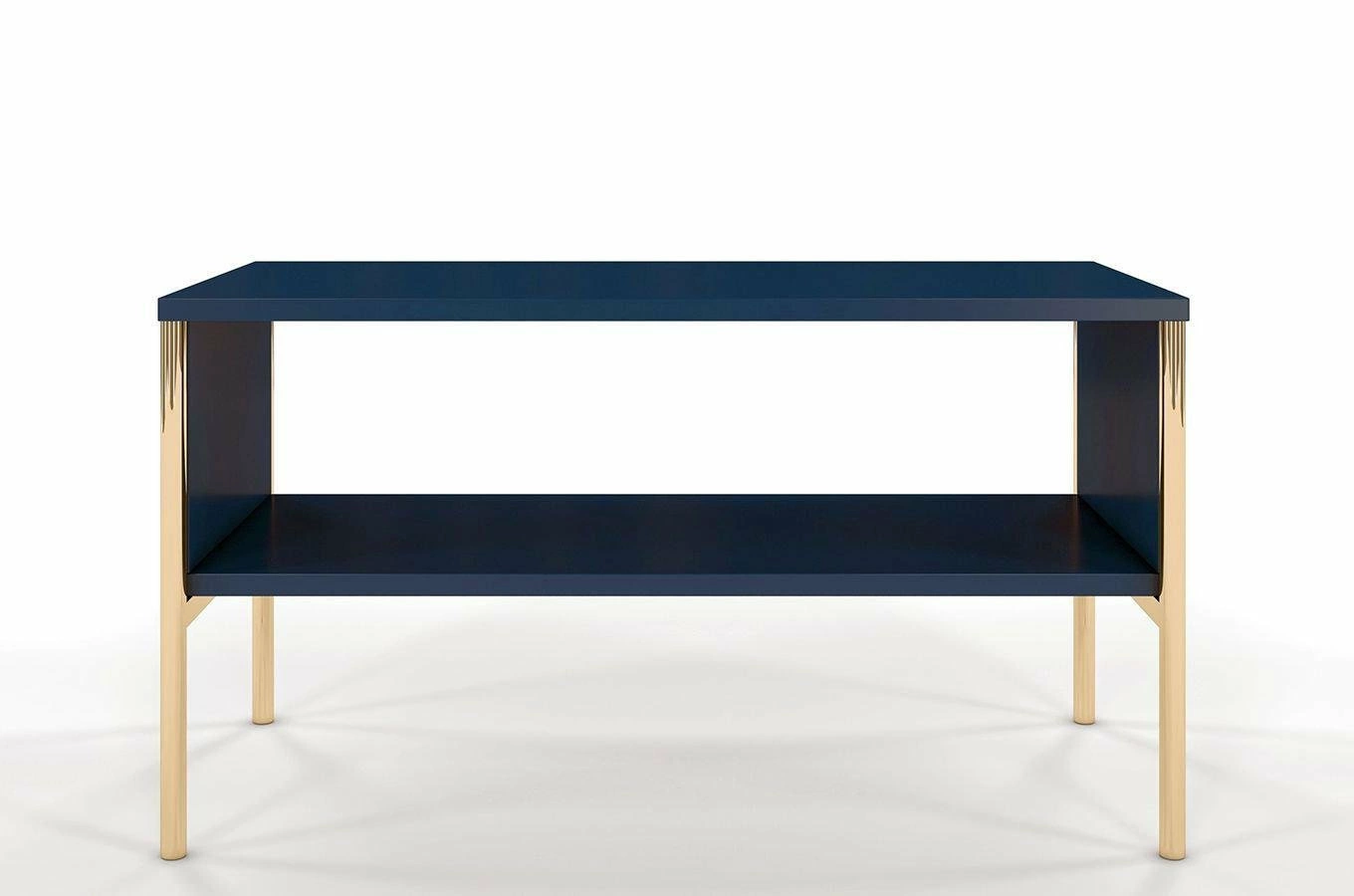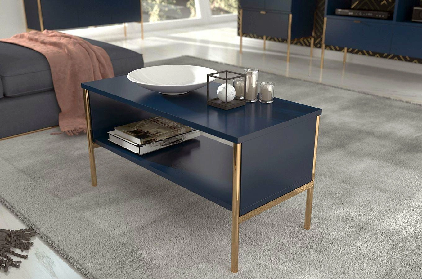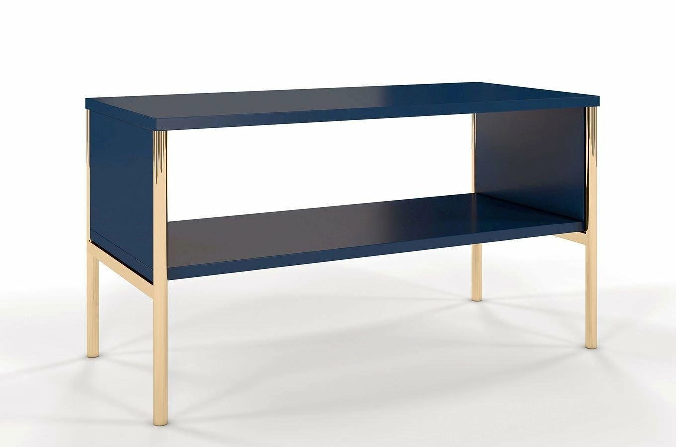 Dřevěný obdélníkový konferenční stolek modrý se zlatými nohami s policí do obývacího pokoje SKANDICA