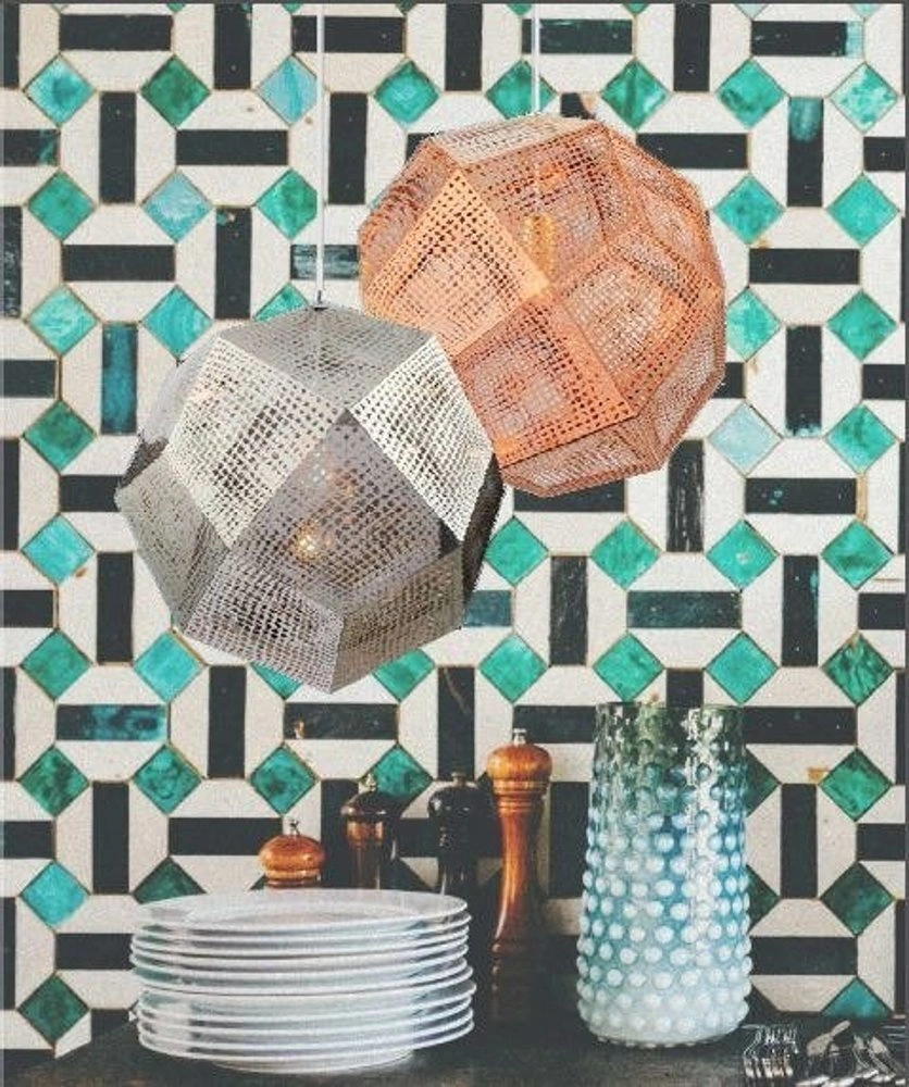 Závěsné svítidlo s geometrickou strukturou z nerezové oceli.