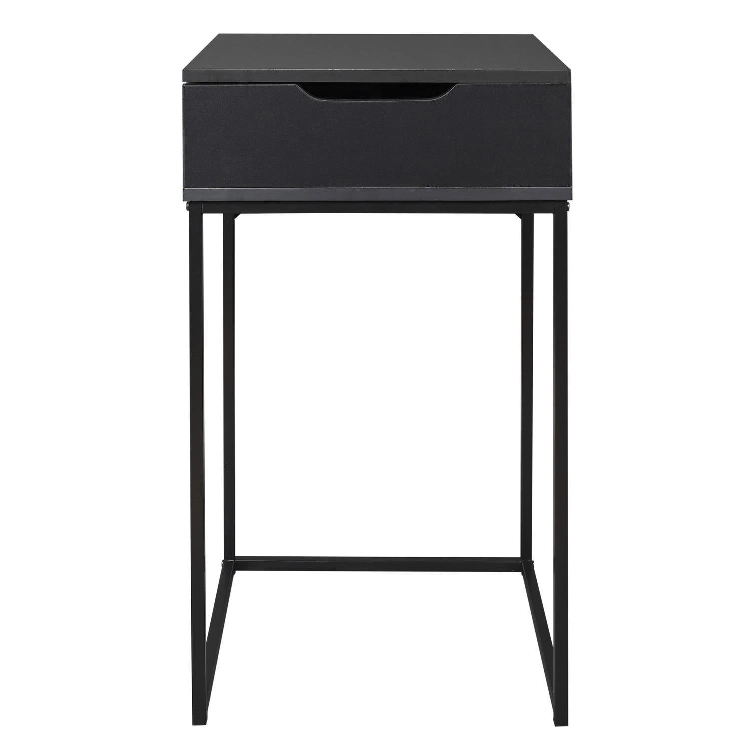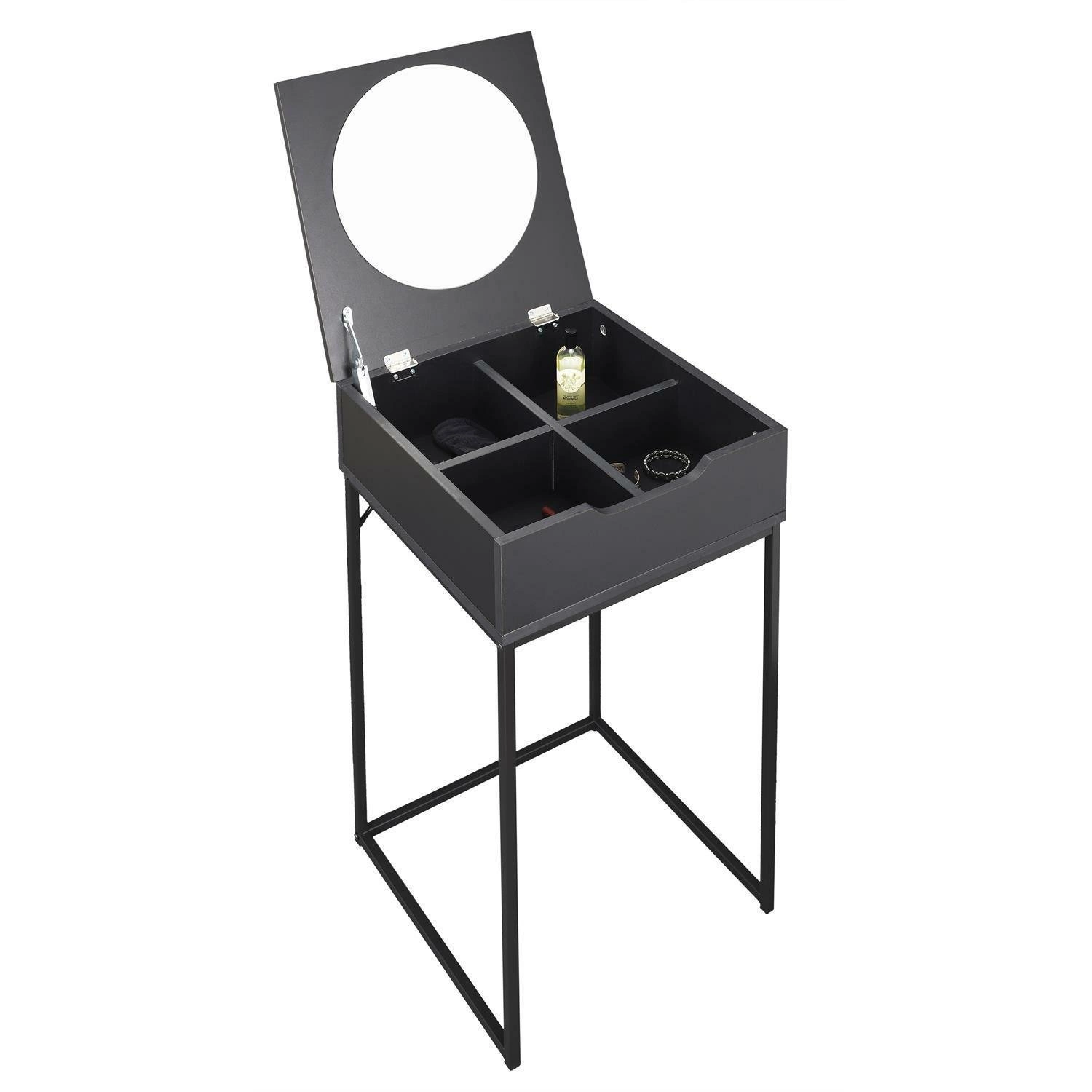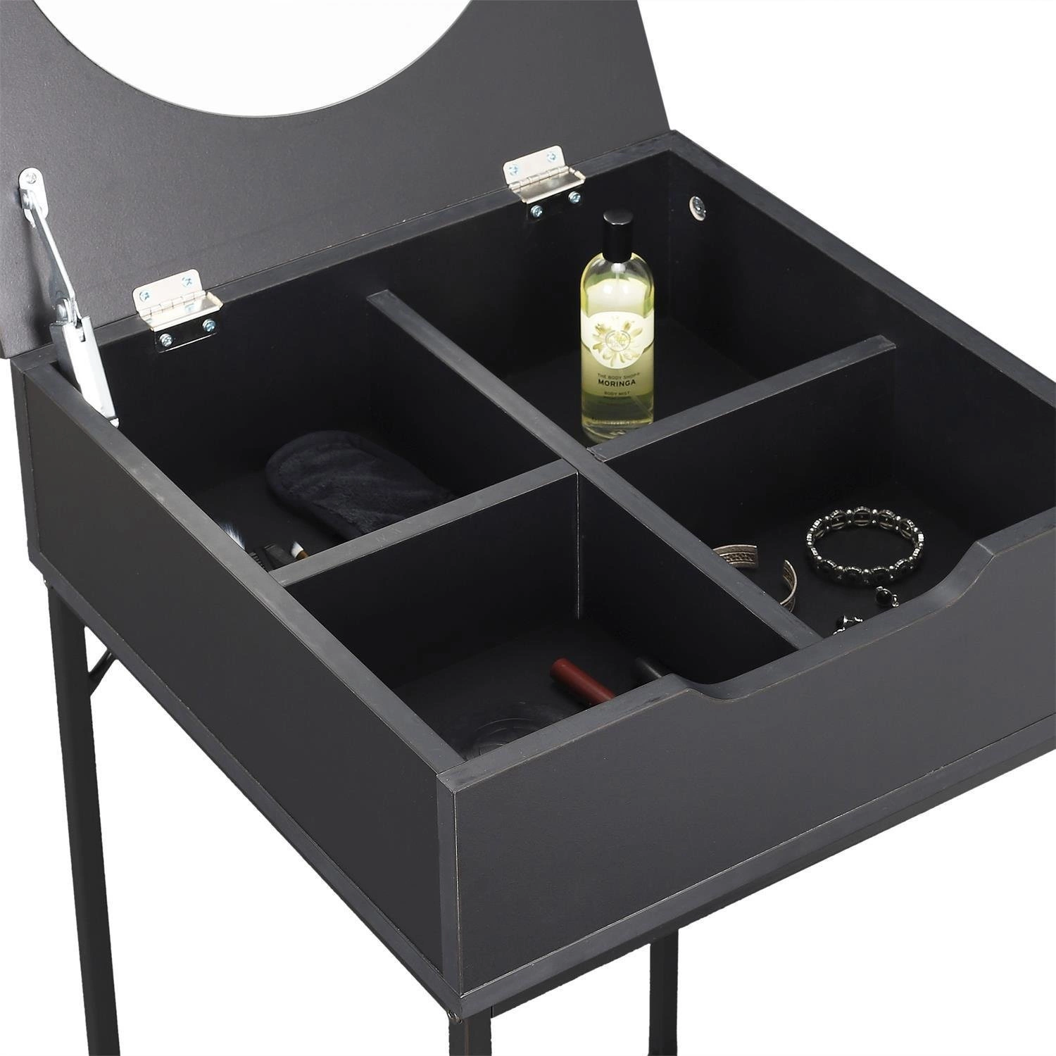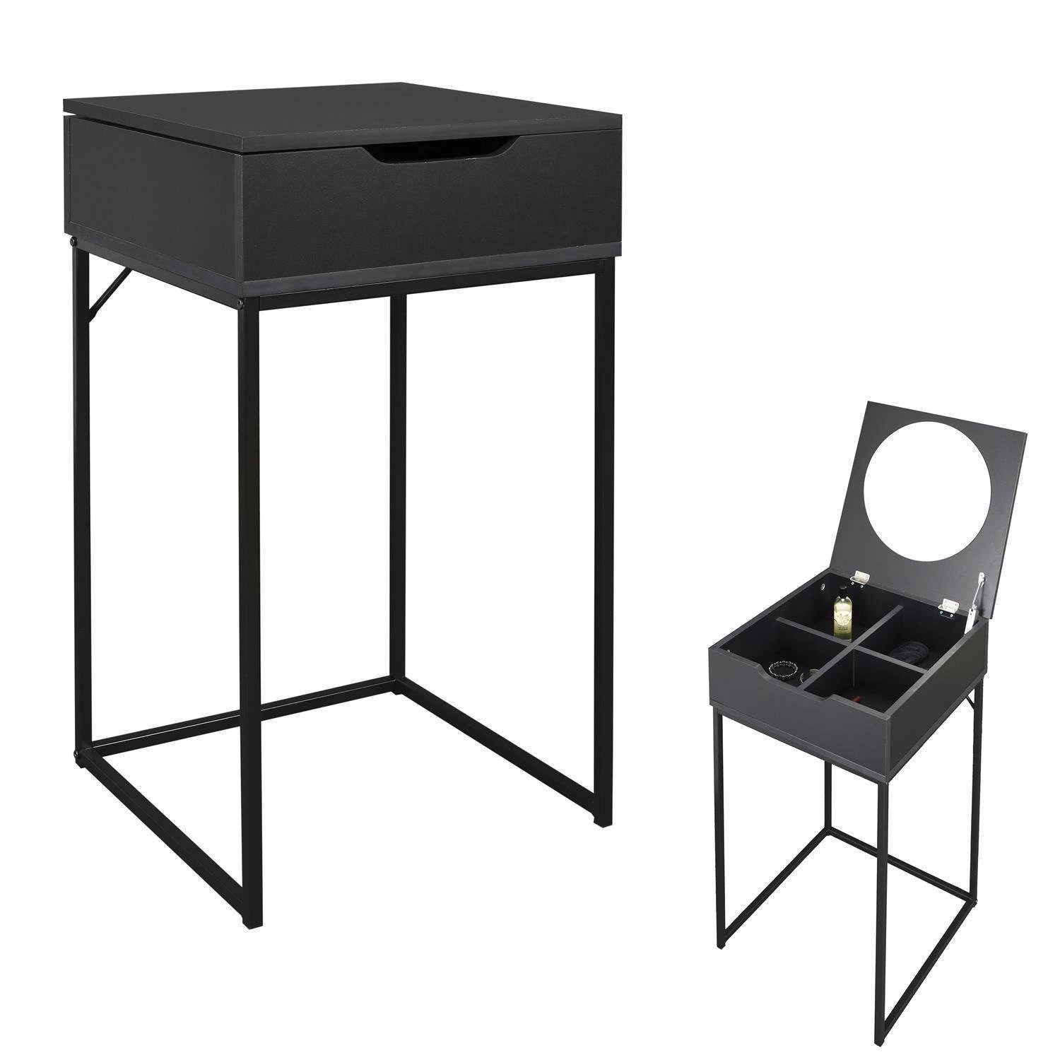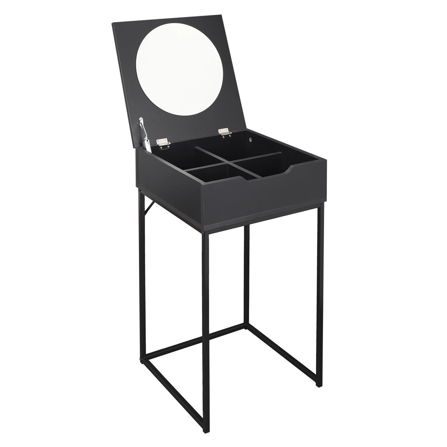 Noční stolek/toaletní stolek Leyla je kompaktní kus nábytku, který vám usnadní líčení. Horní část je vyrobena z černě lakované desky a podstavec je kovový, rovněž v černé barvě. Nábytek je vyroben z vysoce kvalitních materiálů a je stabilní a odolný. Horní část toaletního stolku se otevírá směrem nahoru. Uvnitř je zrcadlo a čtyři přepážky, díky nimž se kosmetika lépe udržuje v pořádku. Prostor pod nábytkem je dostatečně velký na to, abyste do něj mohli snadno uložit puf nebo malou stoličku. Skříň Leyla je velmi funkční kus nábytku, který se skvěle hodí do moderního nebo industriálního interiéru ložnice. Je to také perfektní nápad na dárek pro každého milovníka make-upu.
