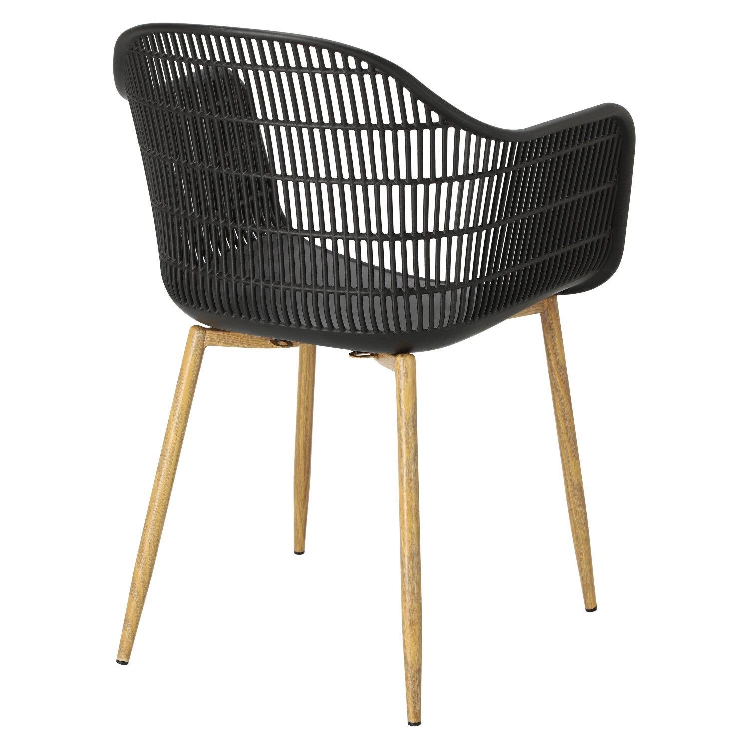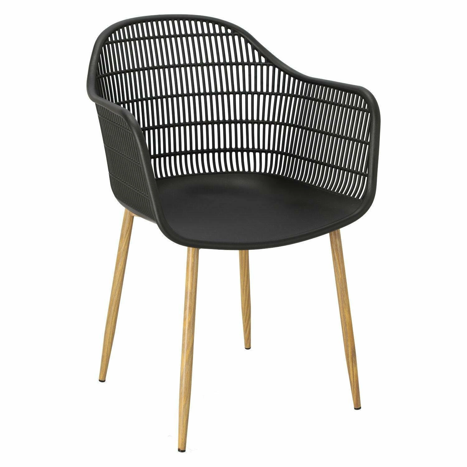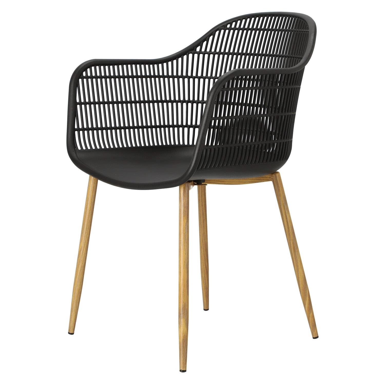 Jídelní židle Becker od značky Simplet spojuje originální boho design, pohodlí při používání a snadnou údržbu. Černá, vzdušná konstrukce s područkami, matný povrch a pevná základna na čtyřech kovových nohách dělají z této moderní plastové židle ideální volbu nejen do jídelny, ale i do kuchyně či obývacího pokoje. Díky šířce 61,5 cm a výšce sedáku 44,5 cm poskytuje komfort při každodenním stolování, rodinných setkáních nebo práci u stolu.