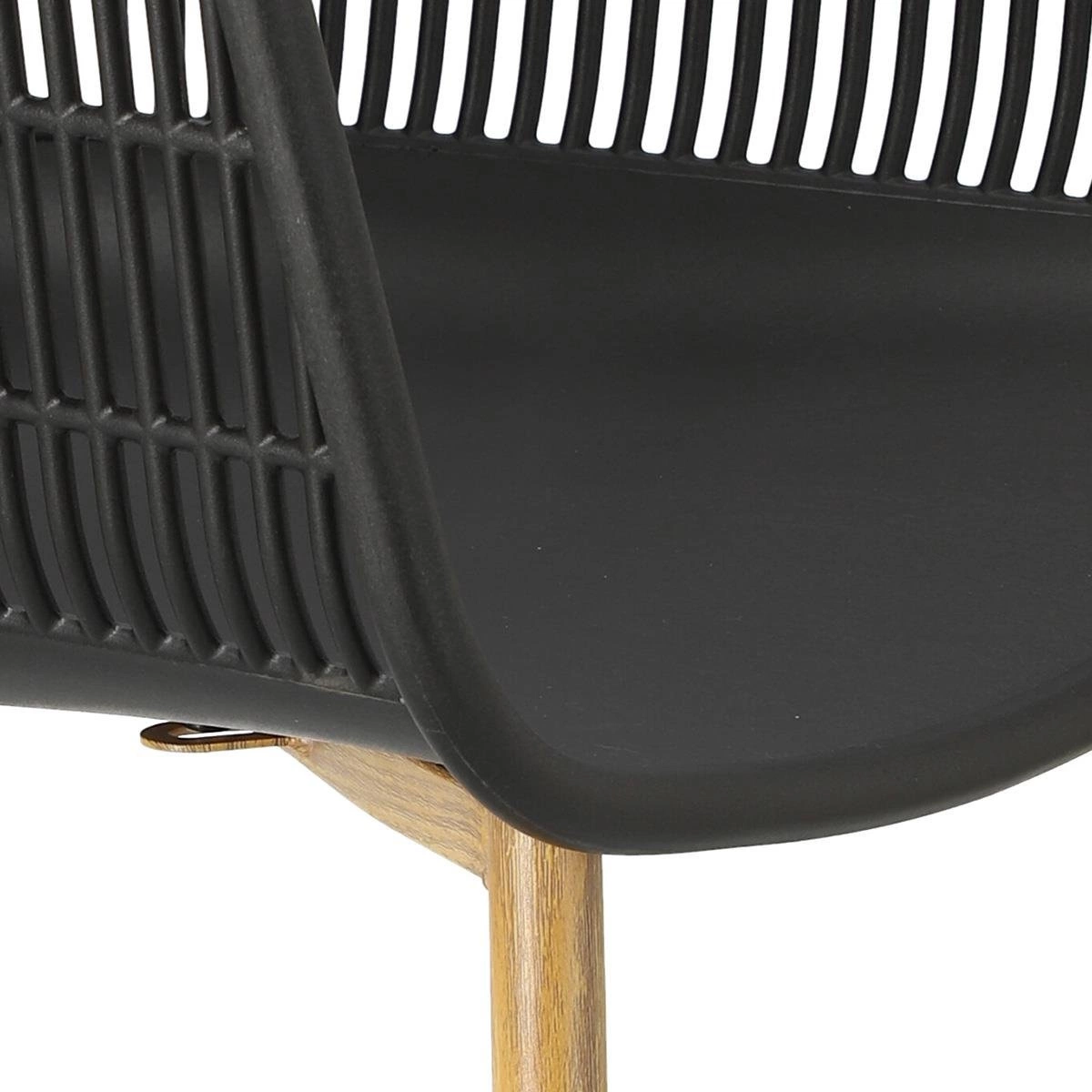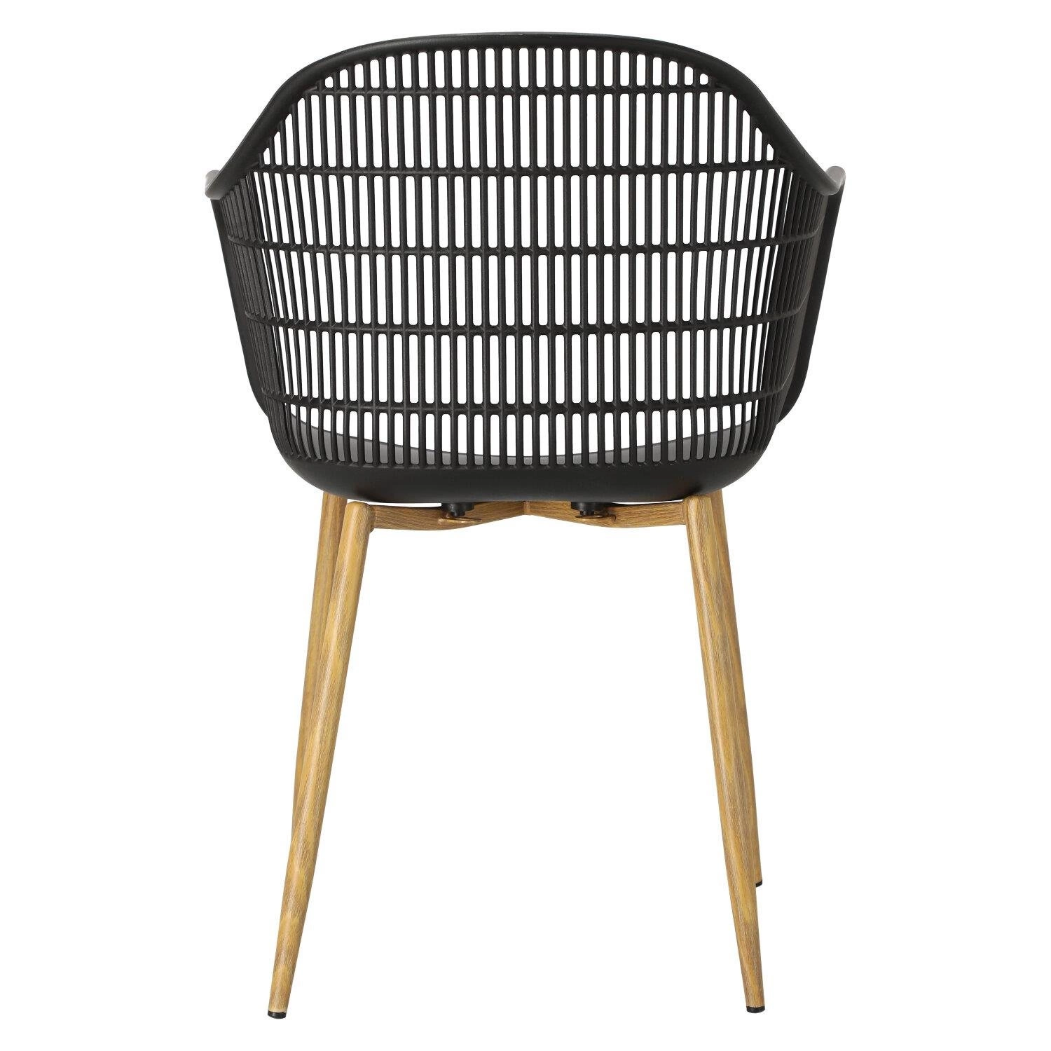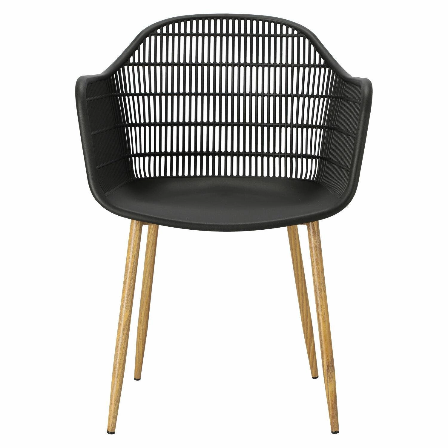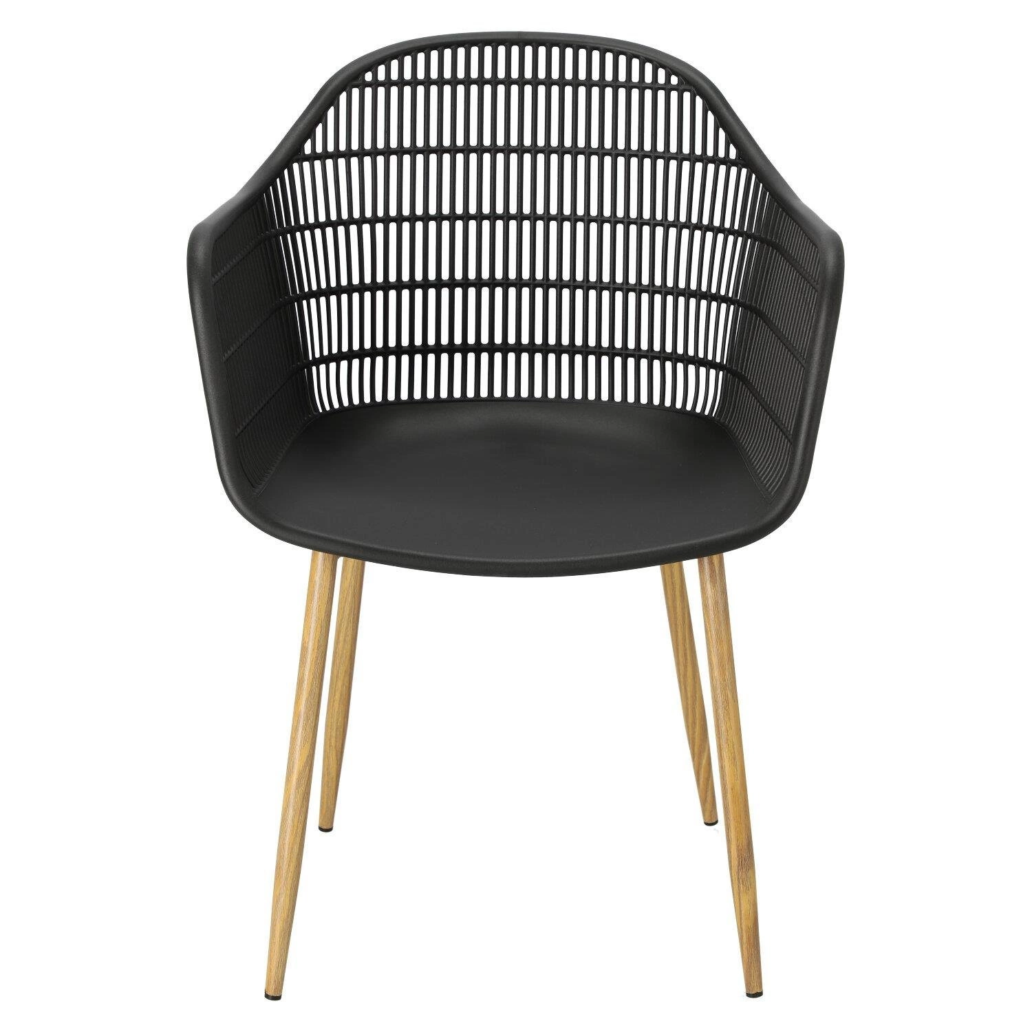 Jídelní židle Becker od značky Simplet spojuje originální boho design, pohodlí při používání a snadnou údržbu. Černá, vzdušná konstrukce s područkami, matný povrch a pevná základna na čtyřech kovových nohách dělají z této moderní plastové židle ideální volbu nejen do jídelny, ale i do kuchyně či obývacího pokoje. Díky šířce 61,5 cm a výšce sedáku 44,5 cm poskytuje komfort při každodenním stolování, rodinných setkáních nebo práci u stolu.