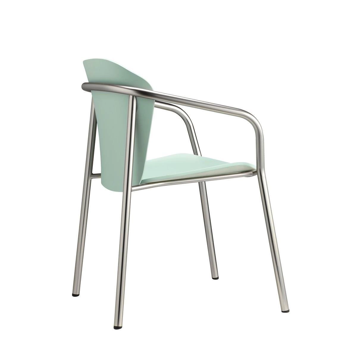 Jídelní židle Finn od značky SCAB Design je kombinací odolného dřevěného sedáku ve světle zeleném odstínu a elegantní kovové podnože v barvě stříbra. Moderní tvar, ergonomické područky a možnost stohování činí tento model ideální volbou jak do domácí jídelny, tak i do komerčních prostor. Díky šířce 58 cm a hloubce 55 cm poskytuje pohodlí i při dlouhých posezeních u stolu.