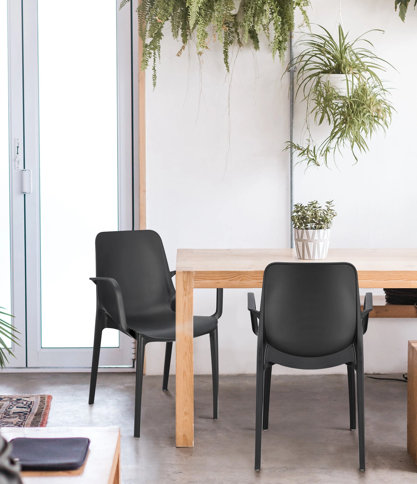 - Pevný plast – odolnost vůči dešti, slunci i proměnlivým teplotám, takže židle je ideální pro venkovní použití během celé sezóny.