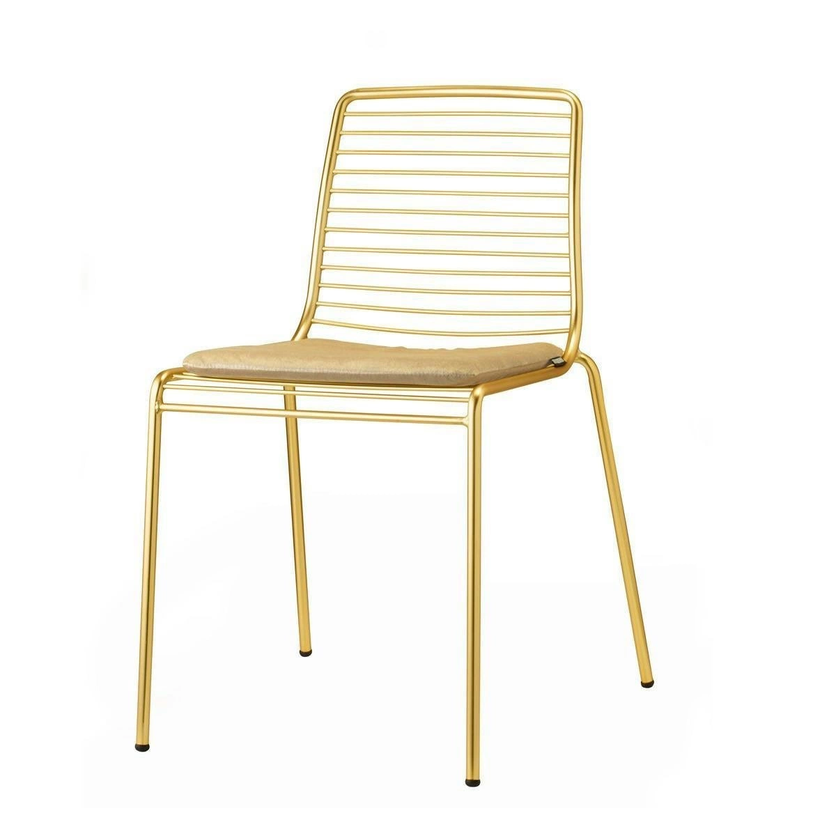 Židle Summer od značky SCAB Design je moderní kovová židle ve zlaté barvě, vybavená pohodlným polštářem na sedáku. Díky lehké, vzdušné drátěné konstrukci a odolnému materiálu je ideální volbou na zahradu, terasu či patio. Optimální rozměry (celková výška 80 cm, šířka 52 cm, hloubka 57,5 cm) a výška sedáku 47 cm zajišťují komfort při používání – ať už relaxujete, nebo pořádáte posezení u stolu venku.