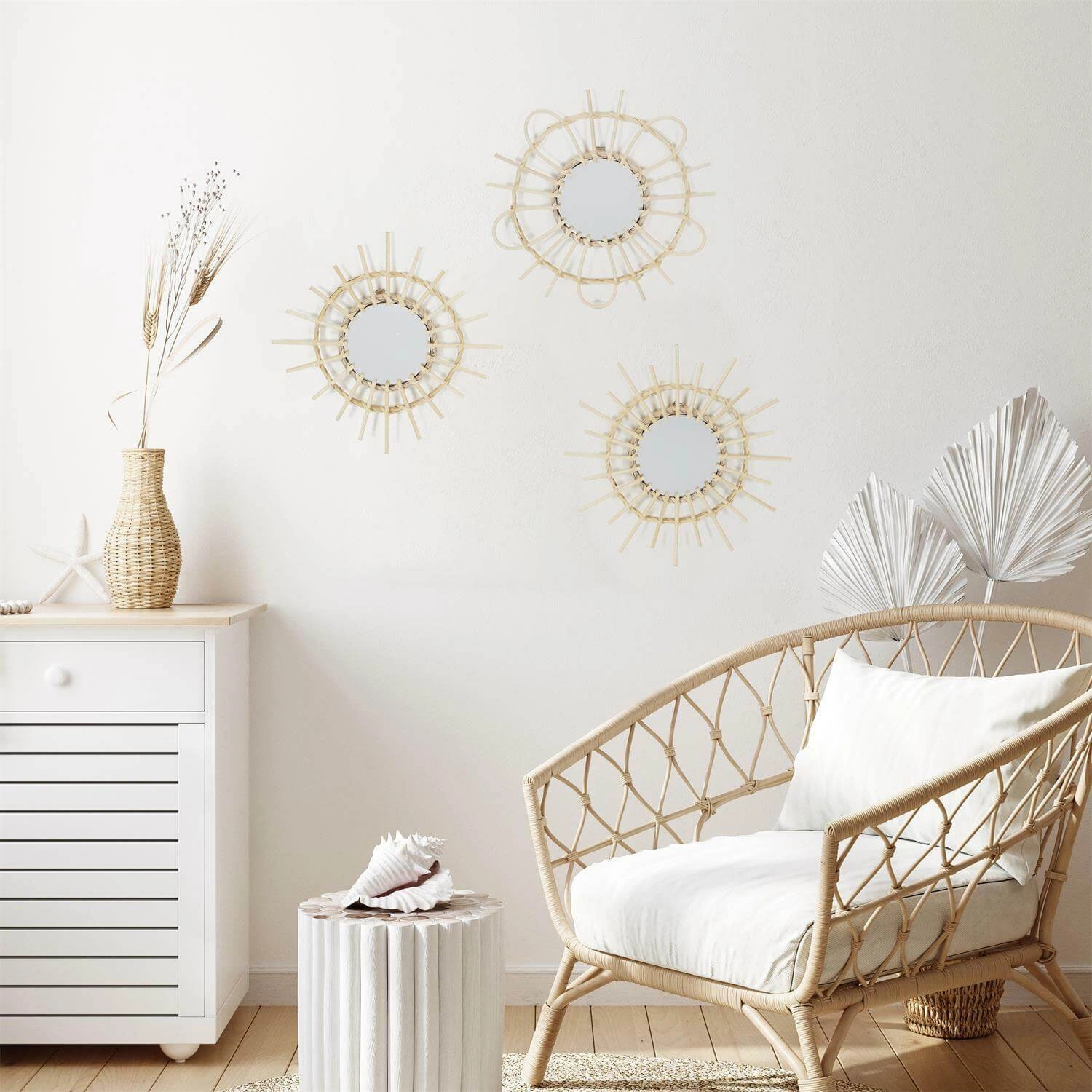 Sada zrcadel Lipsi se skvěle hodí jako zrcadlo do předsíně, kde opticky zvětší a prosvětlí prostor, ale i jako dekorativní zrcadlo do obývacího pokoje nad pohovku nebo komodu. Ratanový rám se dokonale kombinuje se světlými přírodními materiály a dřevem, čímž podtrhuje harmonii boho stylu. Kulatá zrcadla vyniknou také v ložnici, kde mohou sloužit jako jemná nástěnná dekorace nebo praktické zrcadlo k toaletnímu stolku.