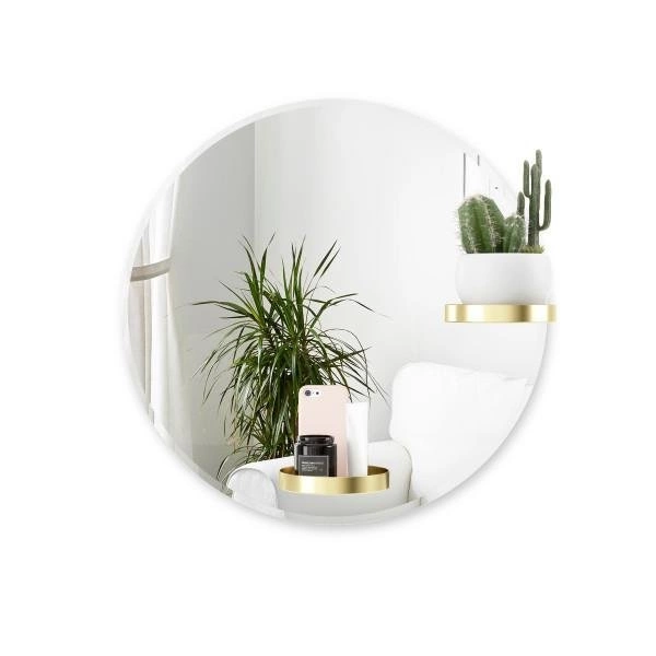 PERCH je zrcadlo o průměru 61 cm, které má krásný design. Jeho hrany jsou zkosené, takže není potřeba žádný rám a zrcadlo vypadá skvěle. Toto jedinečné nástěnné zrcadlo je navíc vybaveno dvěma kulatými zlatými poličkami s vystupujícími okraji, které lze využít jako místo pro vaše oblíbené šperky nebo malý květináč s maximální hmotností 1,4 kg. Velkou výhodou je, že police Perch lze nakonfigurovat 5 různými způsoby a přizpůsobit tak zrcadlo vašemu prostoru. Díky tomu je zrcadlo moderním a univerzálním doplňkem každého interiéru. Spojte ji se sadou polic z kolekce Perch by Umbro a vytvořte jednotný prostor.