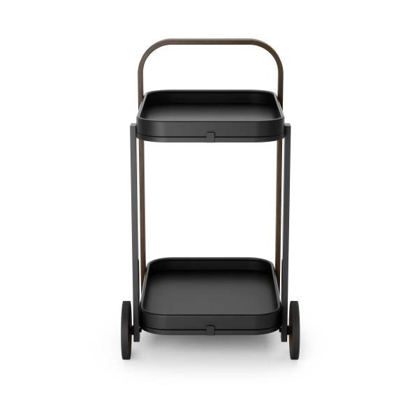 Bellwood dřevěný barový vozík na kolečkách od značky Umbra je stylový, dvoupatrový retro nábytek, který skvěle zapadne jak do obývacího pokoje, tak i na zahradu. Vyrobený ze dřeva v elegantní černé barvě, vybavený praktickými kolečky pro snadné přesouvání, Bellwood vyniká funkčností a originálním designem. Šířka 53 cm a hloubka 44 cm poskytují pohodlnou plochu pro servírování nápojů, občerstvení nebo dekorací, zatímco výška 80 cm umožňuje snadný přístup ke všem úrovním.
