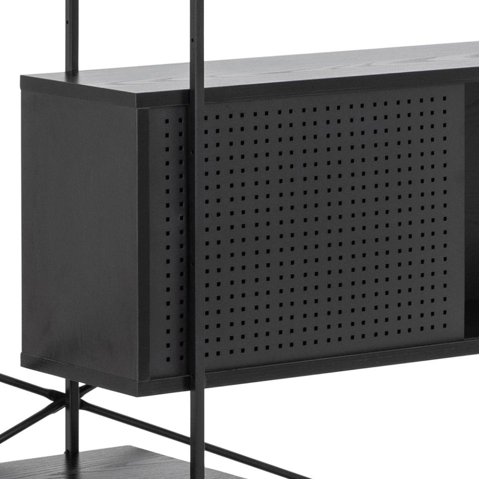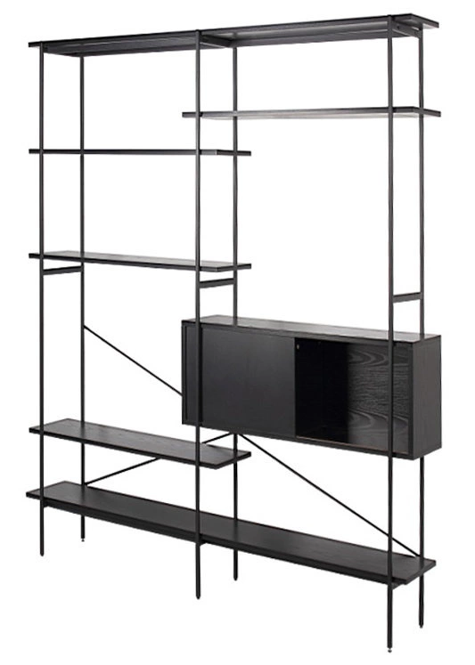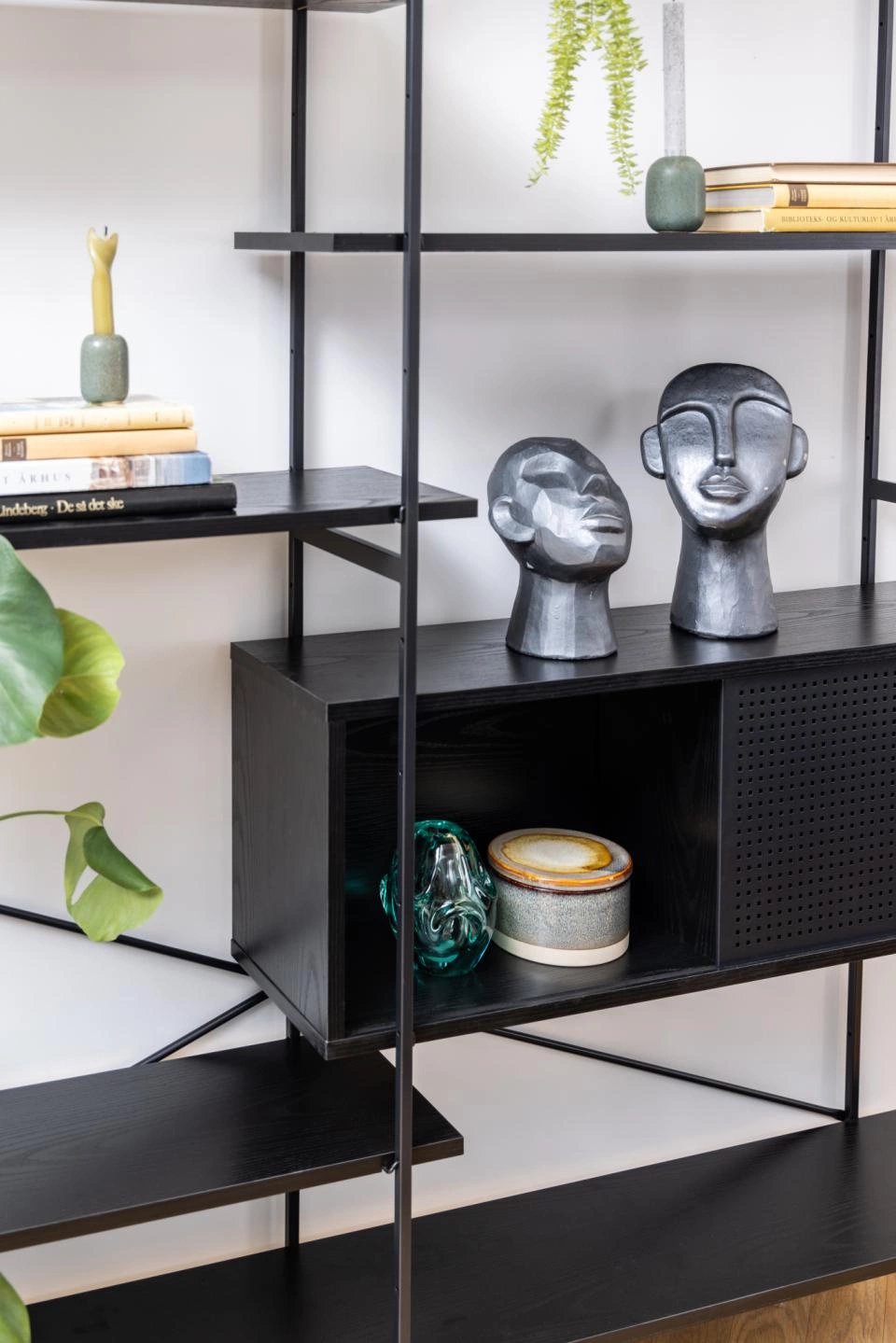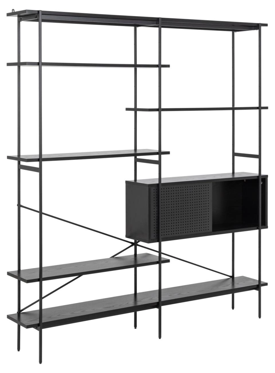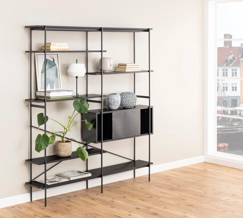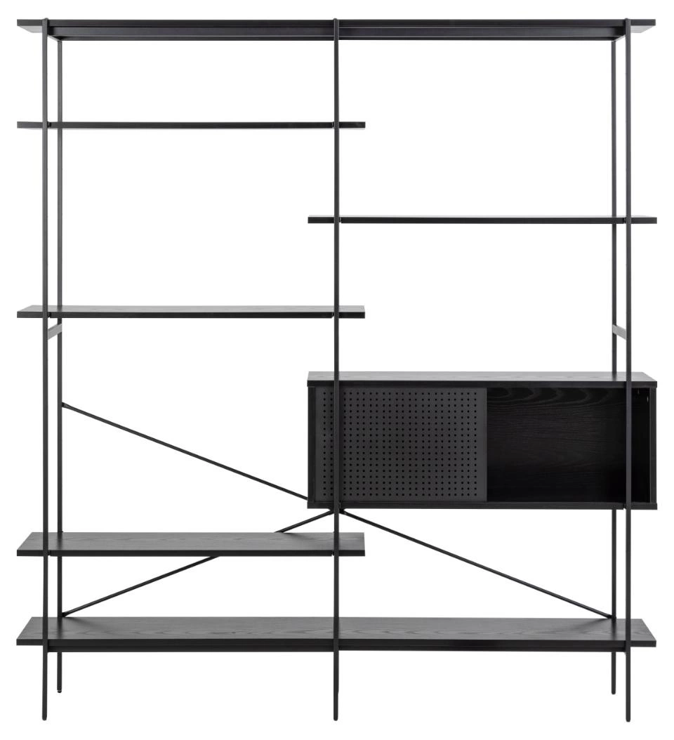 Knihovna Angus je průmyslová knihovna pro uložení velkého množství knih, trofejí nebo jiných předmětů. Je to návrh do obývacího pokoje, ložnice nebo jako alternativa k běžným knihovnám do kanceláře. Knihovna se skládá z černě lakovaného kovového rámu a čtyř kratších a dvou delších polic. Police jsou potaženy dýhou imitující černý jasan, která působí velmi elegantně. Zajímavým prvkem knihovny je skříňka s černě lakovanými kovovými posuvnými dveřmi, do které můžete schovat věci, které nechcete vystavovat. Ažurové čelo skříně dodává skříni nonšalantní a industriální vzhled