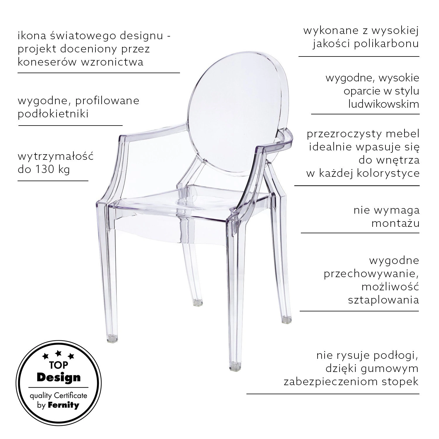 Jídelní židle Royal transparentní od značky D2.DESIGN je ikonou moderního designu, která spojuje působivý vzhled inspirovaný stylem Louis Ghost s maximální funkčností. Vyrobena z odolného, transparentního polykarbonátu, vybavena pohodlnými područkami a možností stohování, dokonale se hodí nejen do jídelny, ale také do obývacího pokoje či komerčních prostor. Vysoký lesk a lehká forma židle decentně podtrhují charakter moderních interiérů, přičemž maximální nosnost až 130 kg zaručuje spolehlivost při každodenním používání.