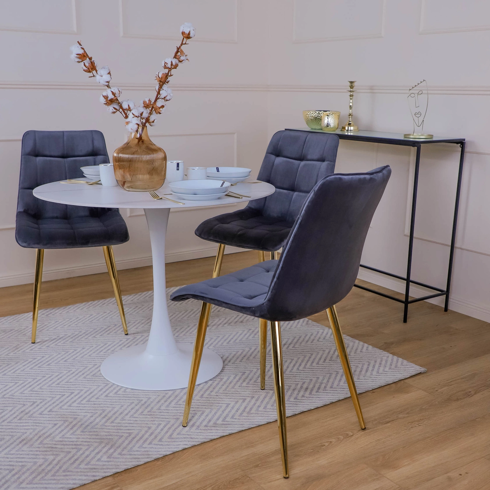 Každý z nás má ve svém domě místo, které je pro nás obzvláště důležité. Touha starat se o tento zvláštní prostor nás nutí zvolit si originální nábytek, který umožní jedinečnou prezentaci. Čalouněná sametová židle PLAID vám pomůže uspořádat prostor tak, abyste se v něm cítili výjimečně a v pohodě. Čalouněný prošívaný sedák židle je díky tvarovanému opěradlu mimořádně pohodlný. Díky tkanině sametové povrchové úpravy se cítíme jako na obláčku, protože si užívá pocit dotyku měkkosti a jemnosti. Židle nemá područky, takže je můžeme zasunout pod každý stůl, což šetří místo. PLAID bude proto skvělou volbou jako konferenční židle nebo jídelní židle s malým stolkem. Zlaté kovové nohy s práškovým lakováním jsou odolné proti poškození. Polomatná povrchová úprava nohou vypadá velmi elegantně a dodává nábytku moderní vzhled.
