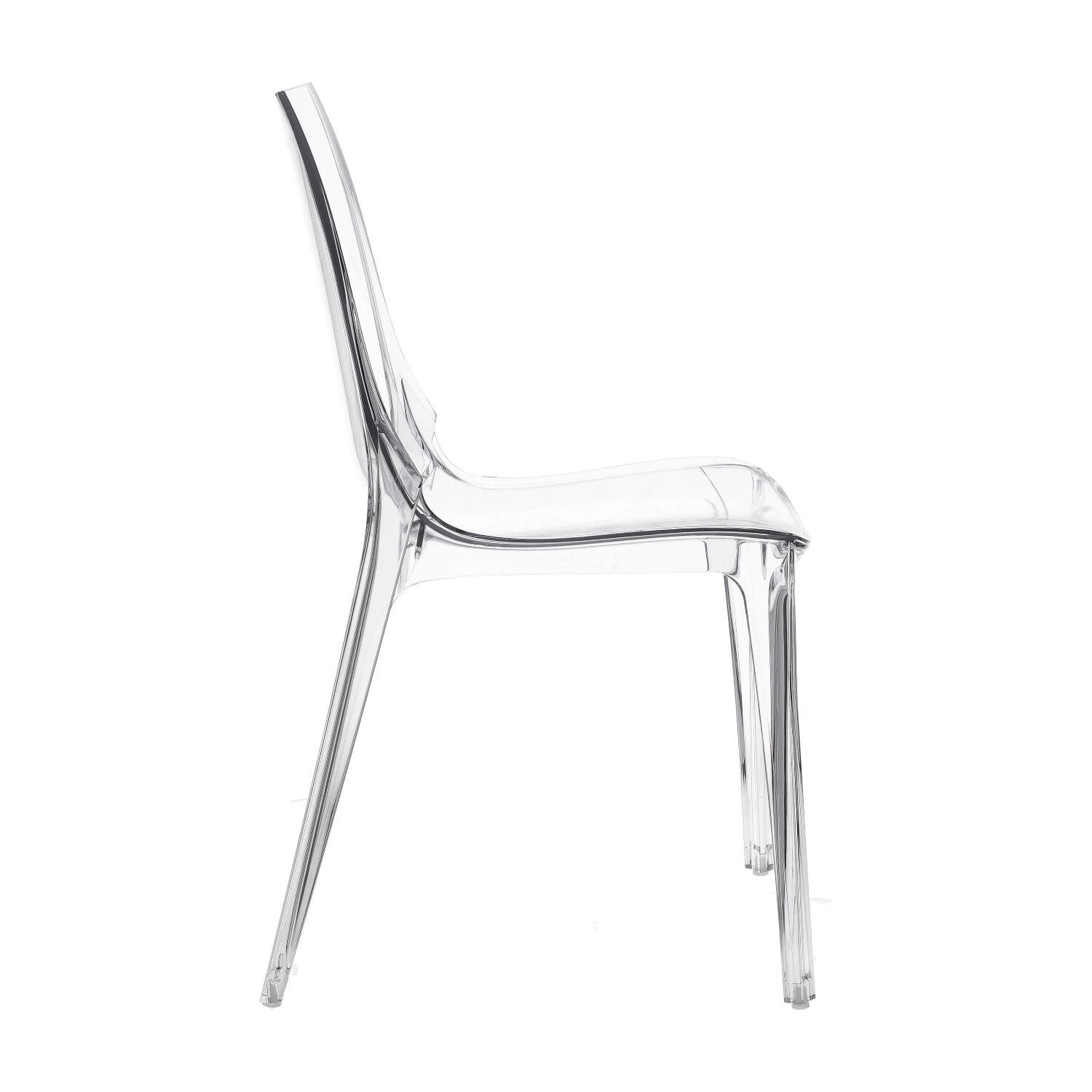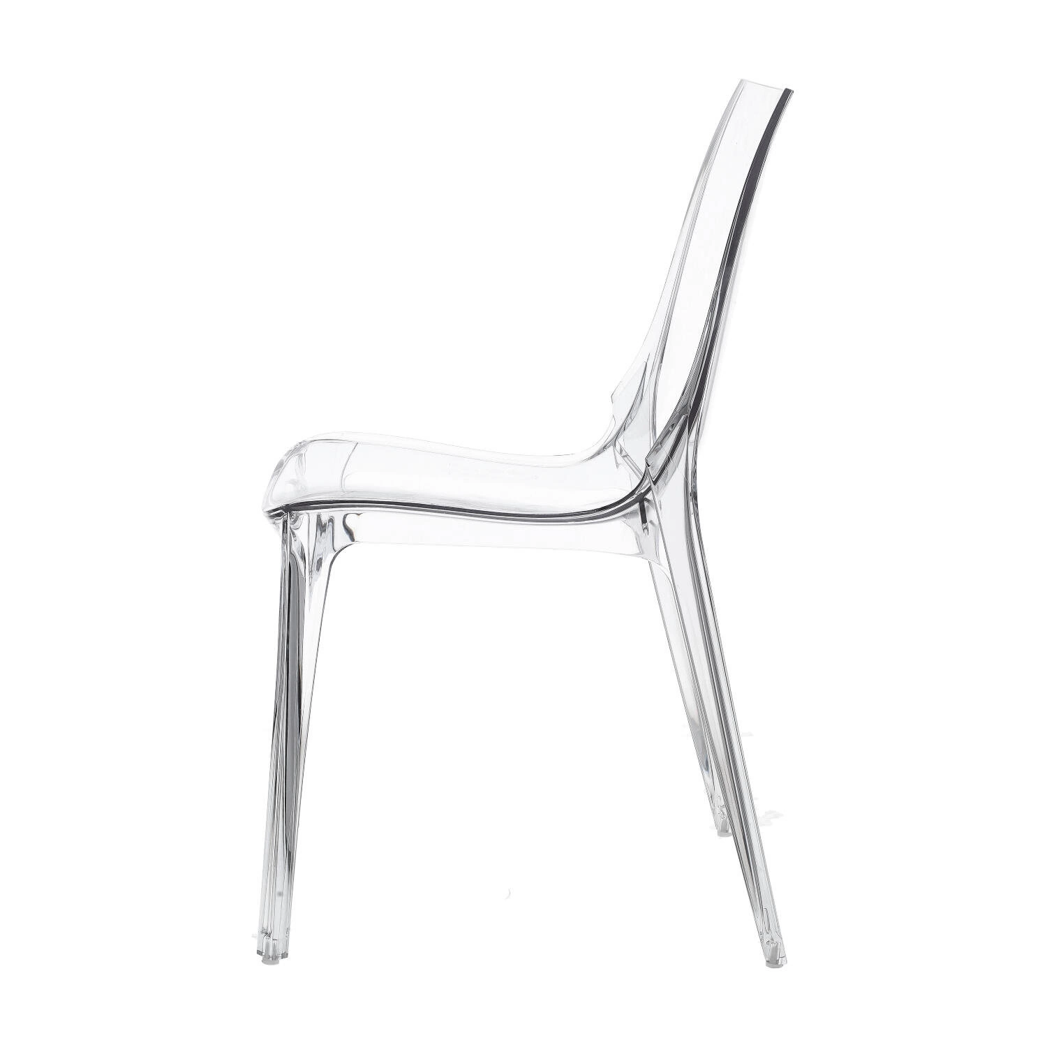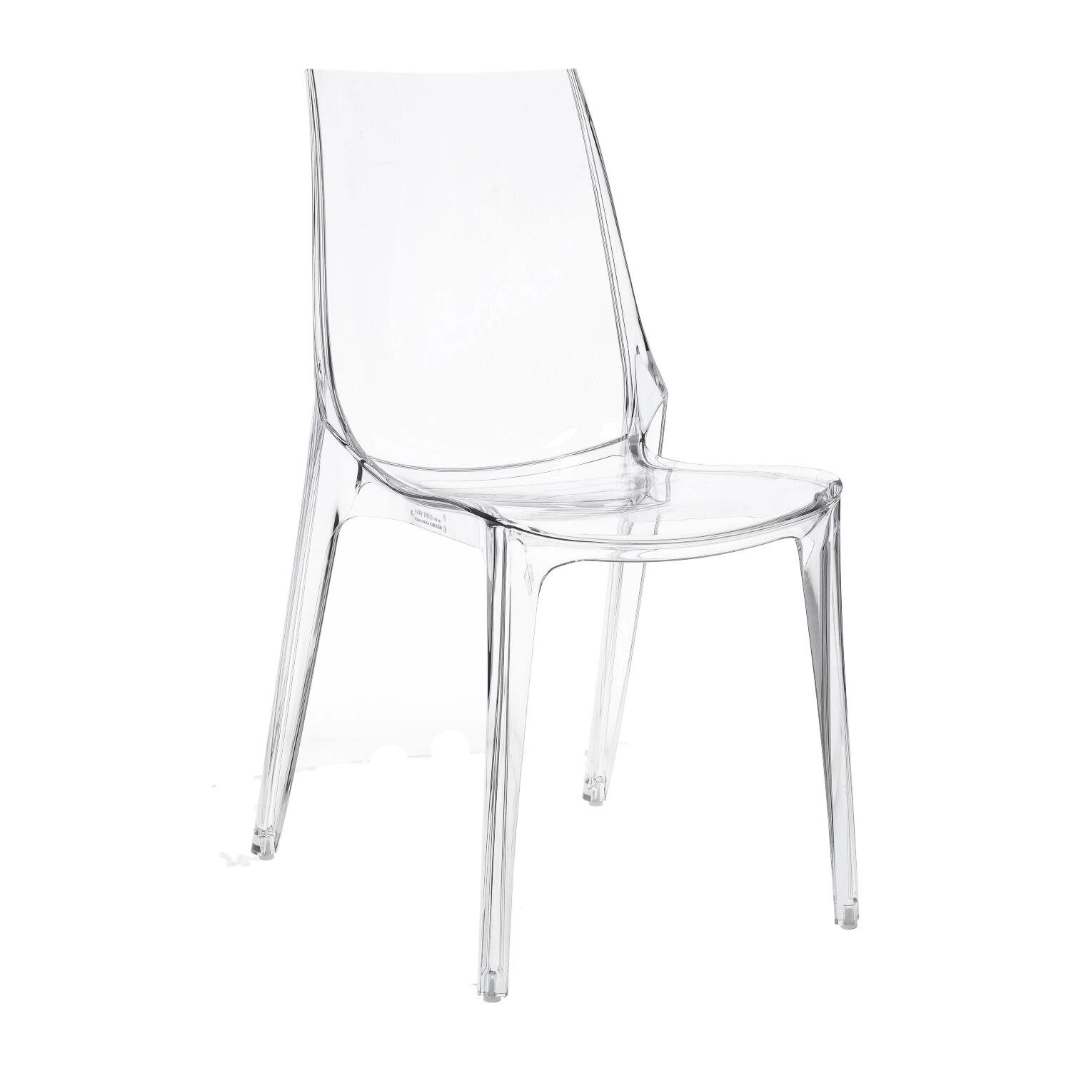 Transparentní židle Vanity od značky SCAB Design je moderní židle z plastu, která zaujme elegantním, průhledným vzhledem a univerzálním využitím. Její štíhlý profil (výška 88 cm, šířka 49 cm, hloubka 55 cm) se skvěle hodí jako jídelní židle, do obývacího pokoje i na zahradu. Tento model je vyrobený z odolného plastu, nevyžaduje montáž a je možné jej stohovat, což usnadňuje skladování a činí jej ideálním také pro komerční prostory.