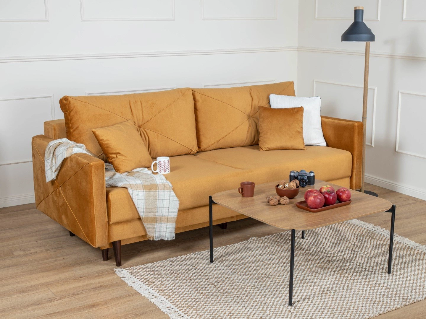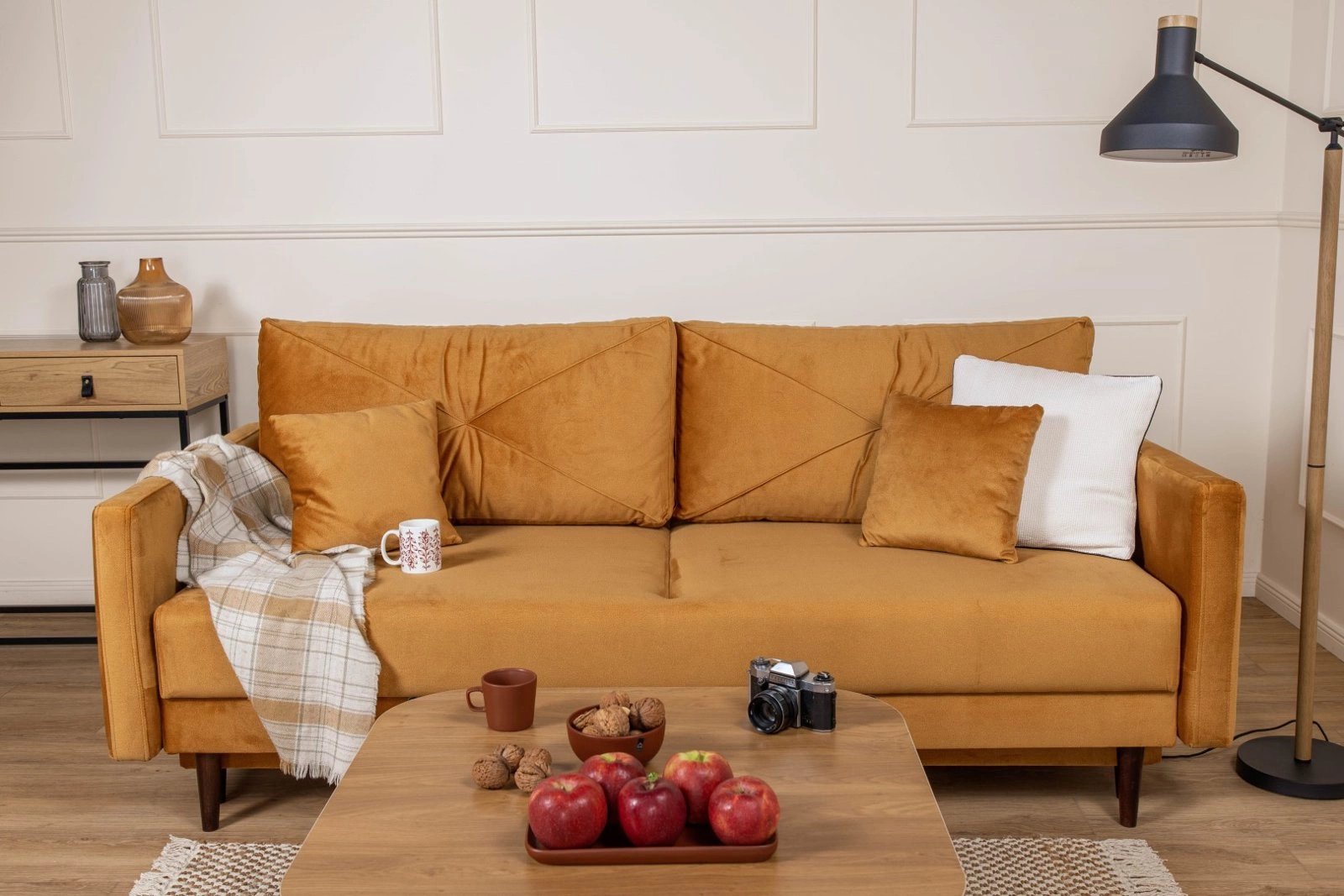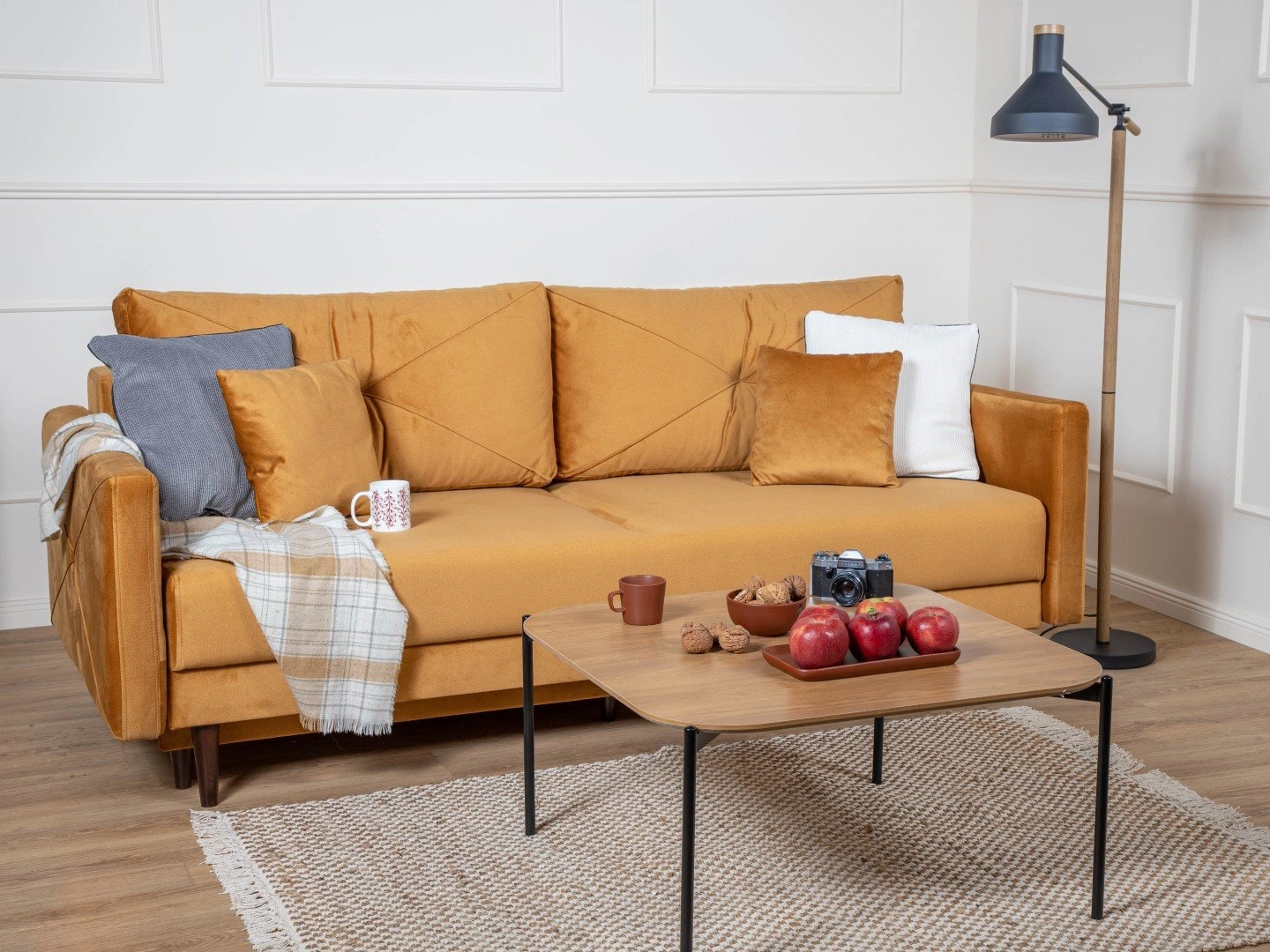 Intenzivní tmavě žlutý odstín dodává pohovce Saxo jedinečný charakter a přináší do interiéru pozitivní energii. Moderní tvar, štíhlé područky a elegantní dřevěné nohy v tmavém ořechovém tónu podtrhují lehkost i svěží vzhled celé sestavy. Tento model je ideální pro moderní interiéry – oživí prostor a přidá mu originální styl. Perfektně se hodí jako centrální prvek obýváku, stejně tak do studentského pokoje nebo domácí pracovny, kde je potřeba funkčnost i výrazný barevný akcent.