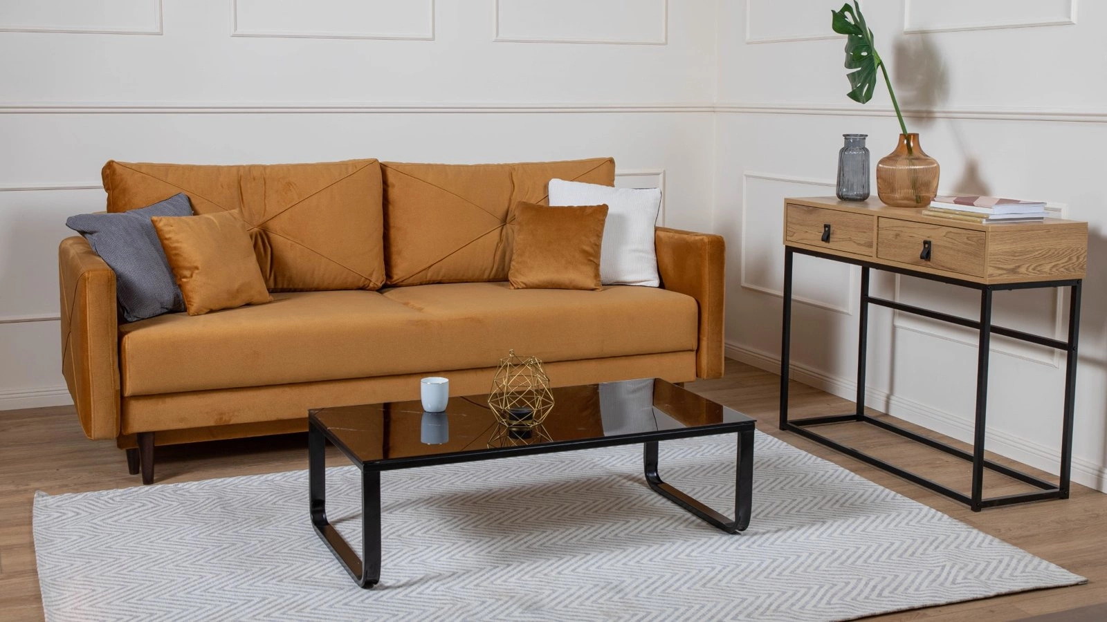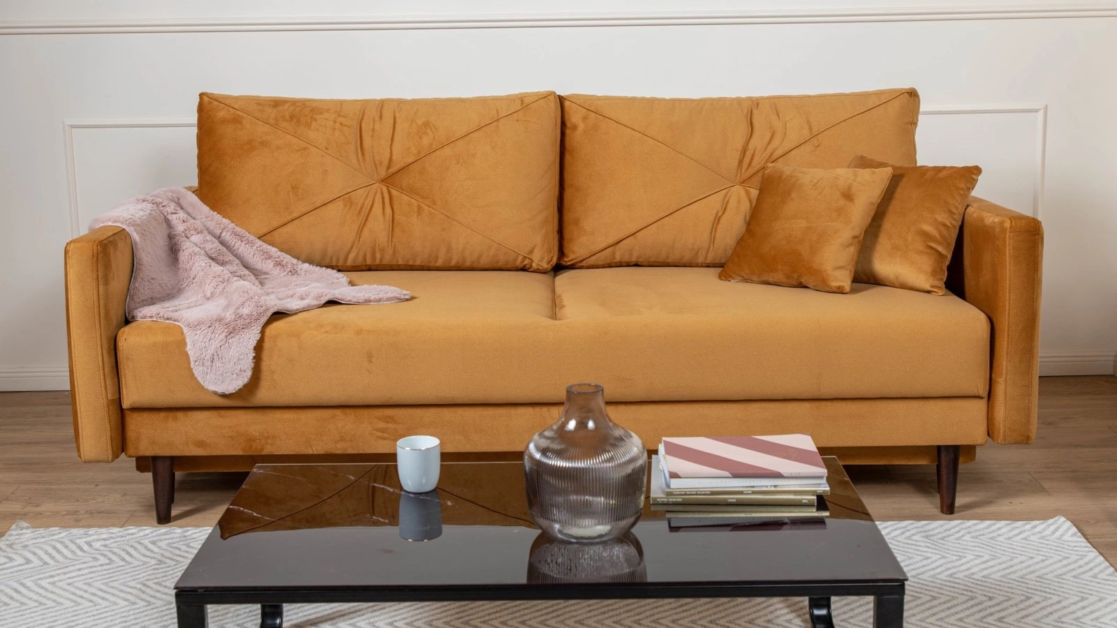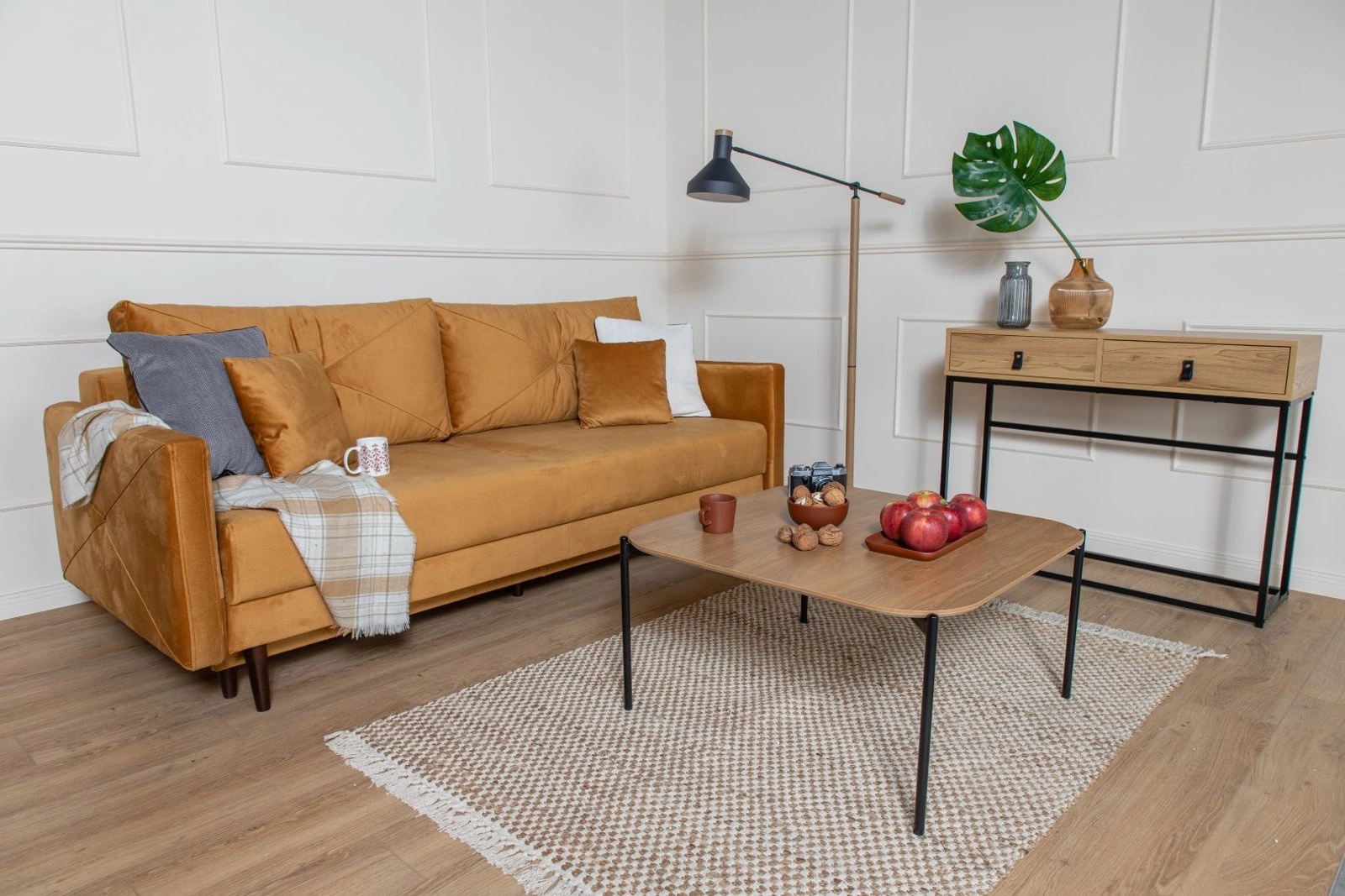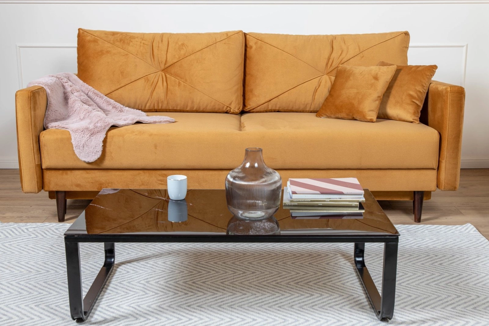 Intenzivní tmavě žlutý odstín dodává pohovce Saxo jedinečný charakter a přináší do interiéru pozitivní energii. Moderní tvar, štíhlé područky a elegantní dřevěné nohy v tmavém ořechovém tónu podtrhují lehkost i svěží vzhled celé sestavy. Tento model je ideální pro moderní interiéry – oživí prostor a přidá mu originální styl. Perfektně se hodí jako centrální prvek obýváku, stejně tak do studentského pokoje nebo domácí pracovny, kde je potřeba funkčnost i výrazný barevný akcent.