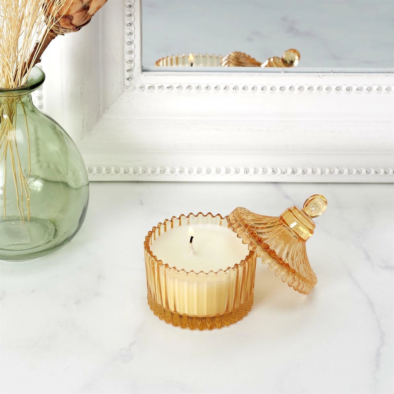 Nechte se okouzlit svíčkou ve fenomenálním svícnu inspirovaném českým sklem. Svíčka v nádobě s víčkem vydává při hoření neuvěřitelně atmosférické rozptýlené světlo. Je to také fantastická dekorace, když se rozhodnete nepoužít svíčku. Parfémovaná svíčka s vůní jantaru zklidní vaše nervy po náročném dni svou jemnou, svěží vůní. Svíčka vydrží hořet až 10 hodin.