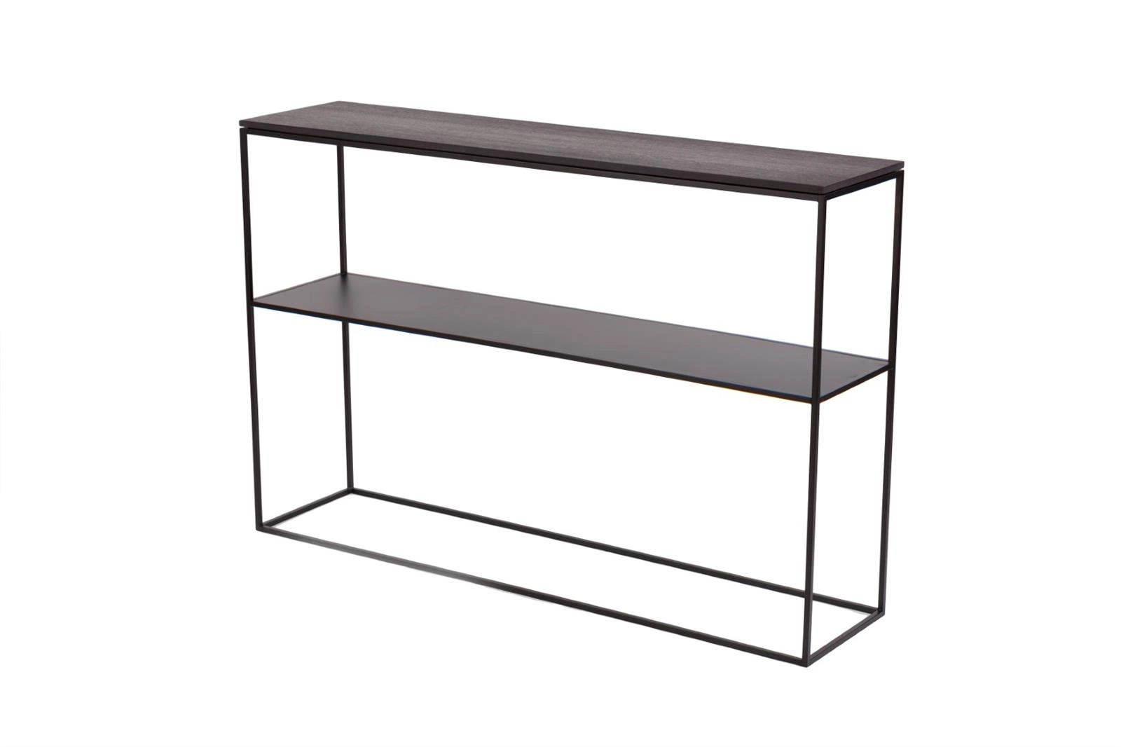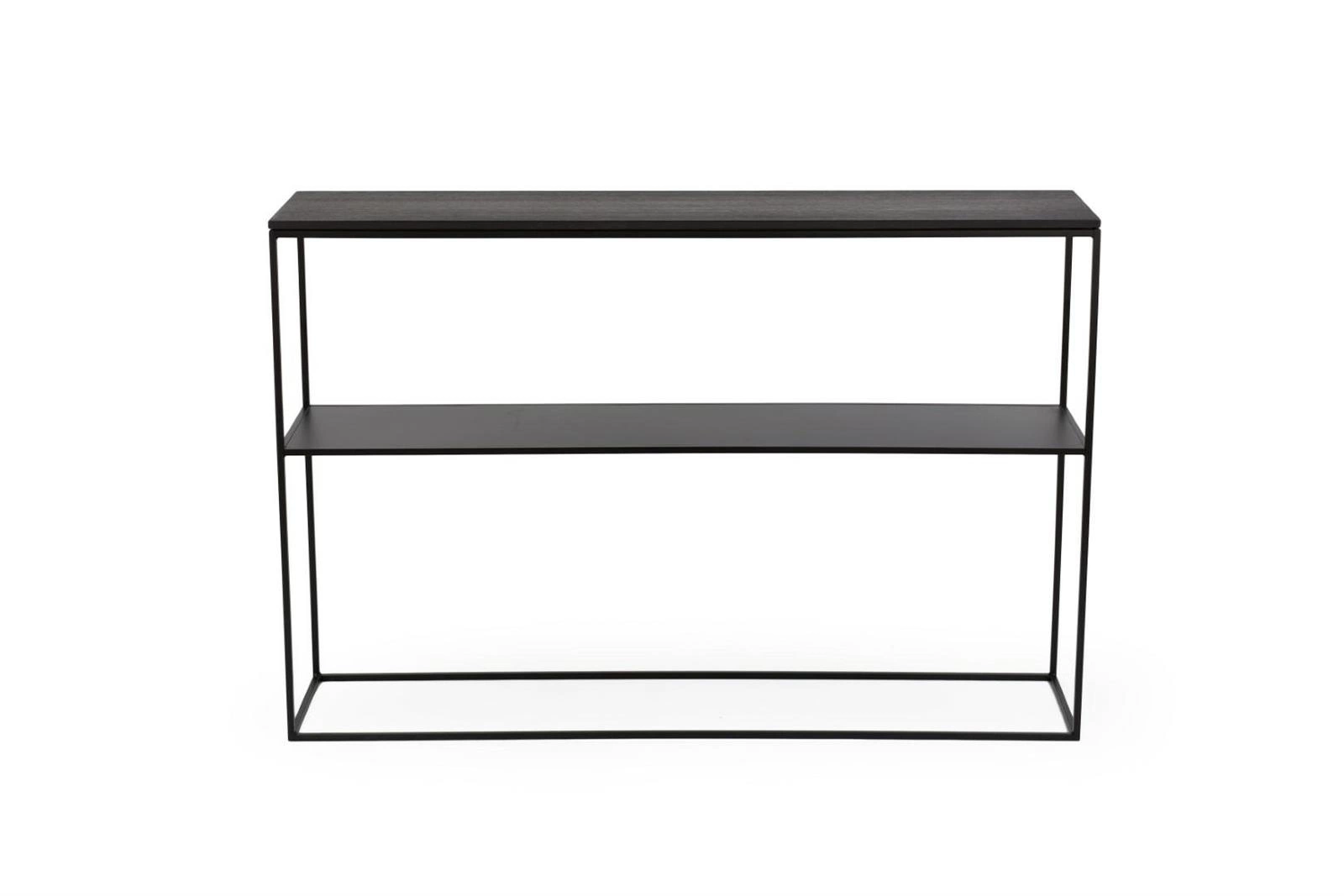 Konzolový stolek STAM 280 od značky NORDIFRA je moderní odkládací stolek do obývacího pokoje i předsíně, který spojuje geometrický design s maximální praktičností. Deska o šířce 118 cm a hloubce 28 cm je vyrobena z dýhované desky v odstínu černého dubu, což nábytku dodává elegantní a sofistikovaný vzhled. Stabilní základna z černého kovu a dvojitá police činí z této konzoly ideální volbu pro moderní interiéry.