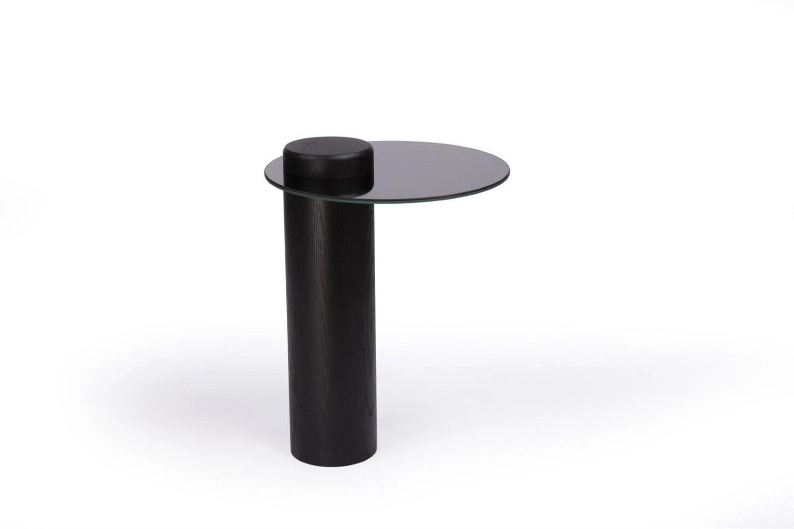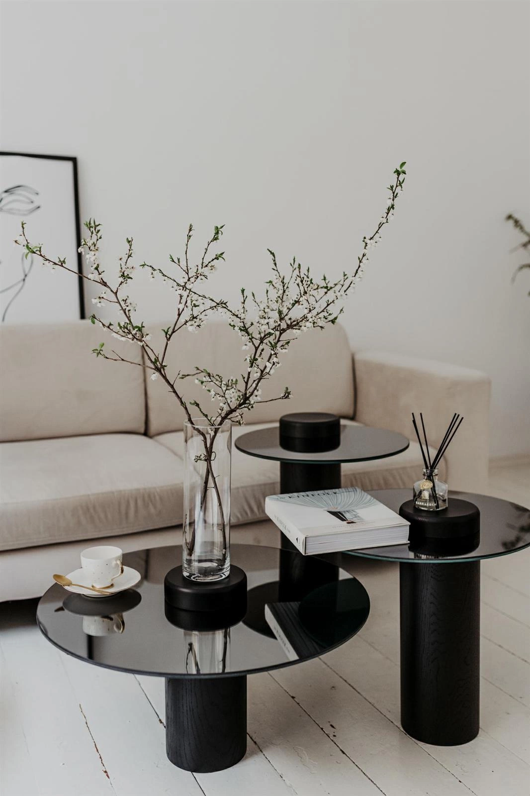 Kulatý konferenční stolek TYK 430 zrcadlová deska černý dub moderní do obýváku NORDIFRA – spojení přírodního dřeva a elegance skla