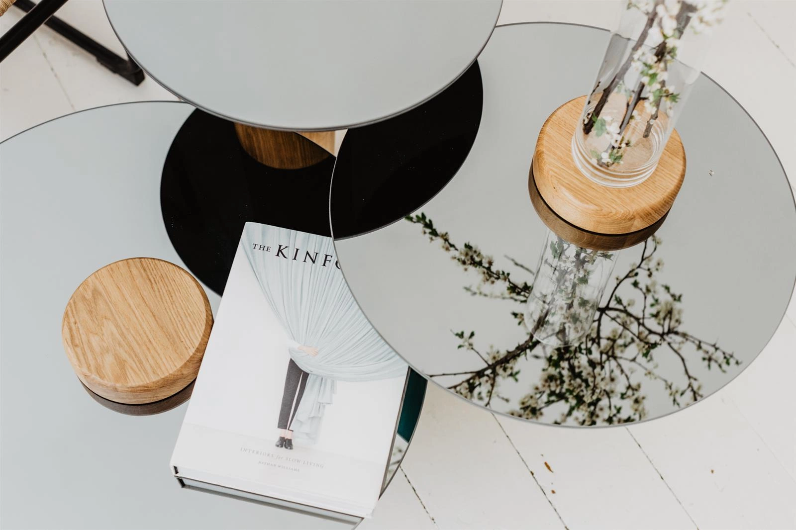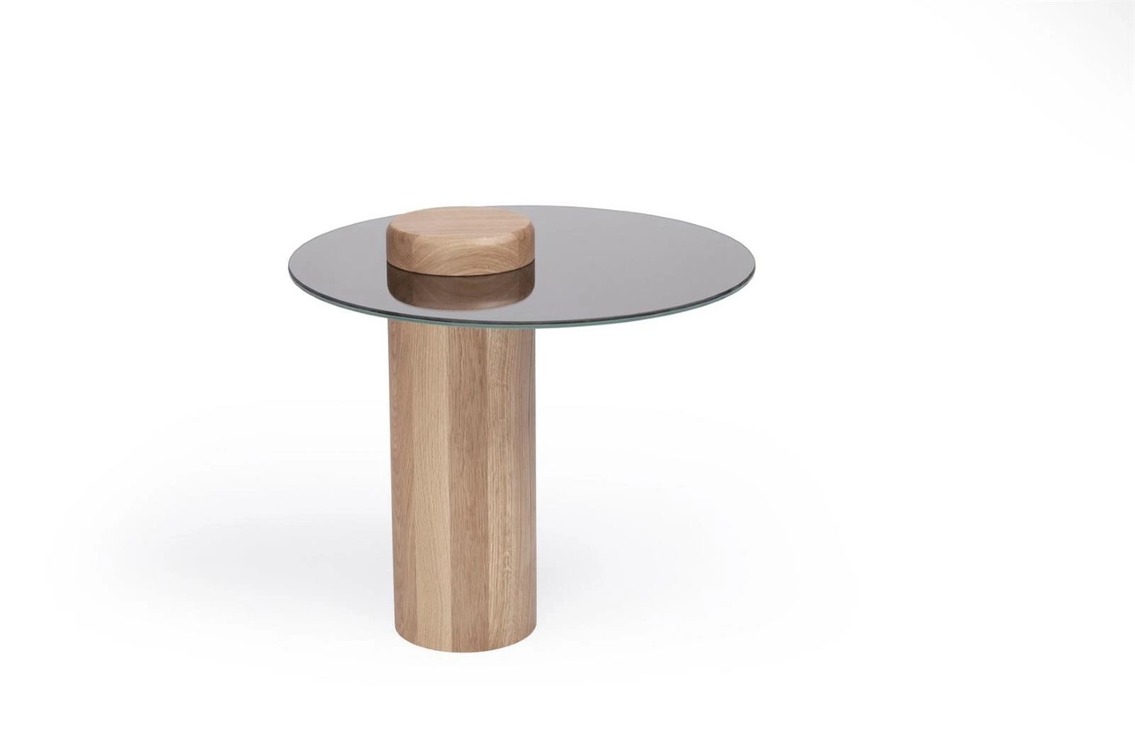Kulatý konferenční stolek TYK 500 dubový se zrcadlovou deskou – moderní prvek do obývacího pokoje od značky NORDIFRA