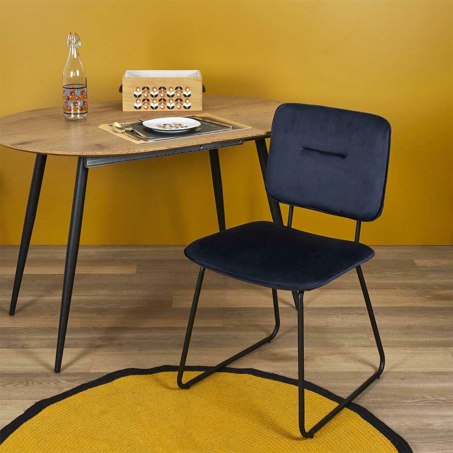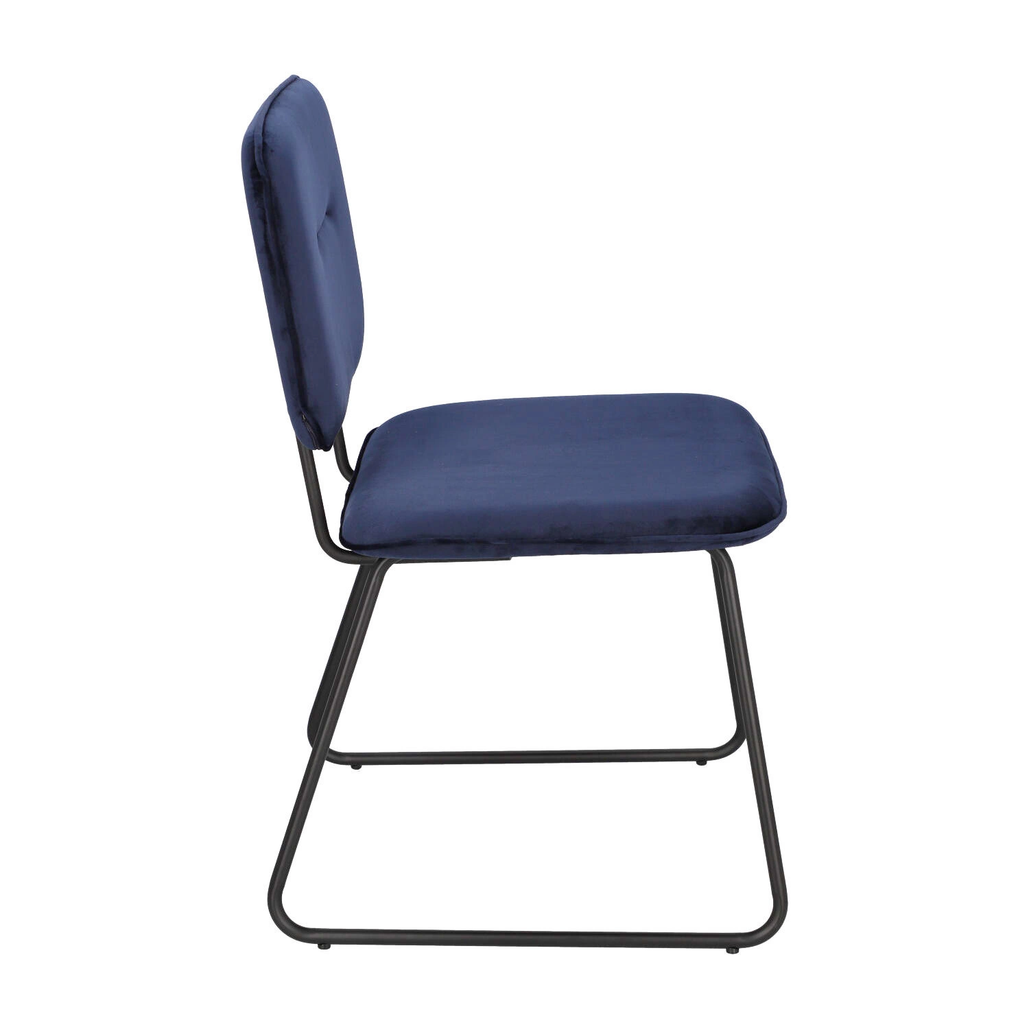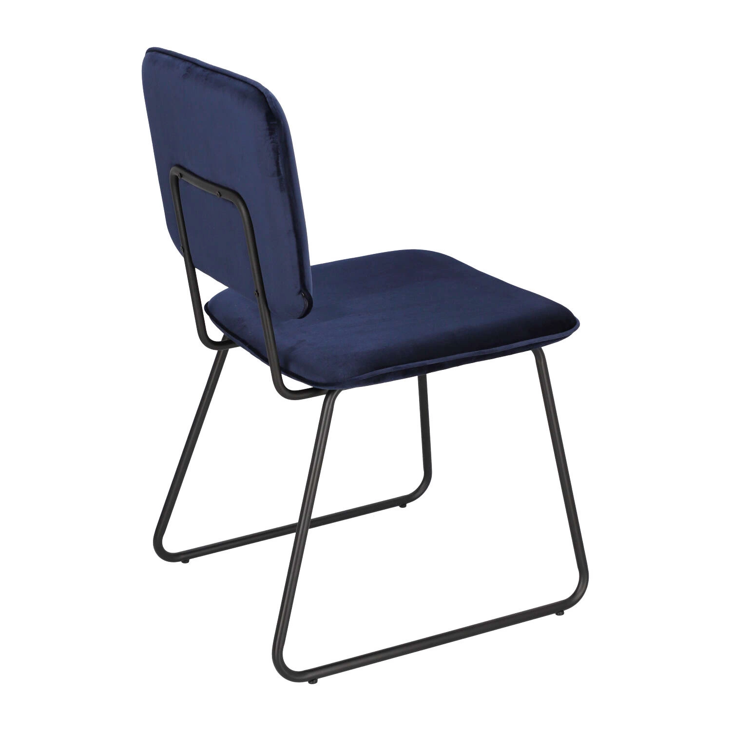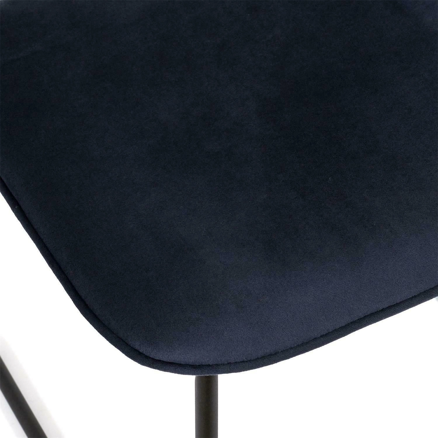 Čalouněná židle Adele od značky Intesi je spojením moderního designu a maximálního pohodlí, které skvěle vynikne jako jídelní židle, do obývacího pokoje nebo kuchyně. Sametové čalounění v hluboké, tmavě modré barvě dodává eleganci, zatímco černý kovový rám na lyžinách zajišťuje stabilitu a výrazný, industriální nádech. Šířka 48 cm a výška sedáku 47 cm poskytují komfort i při delším posezení u stolu.