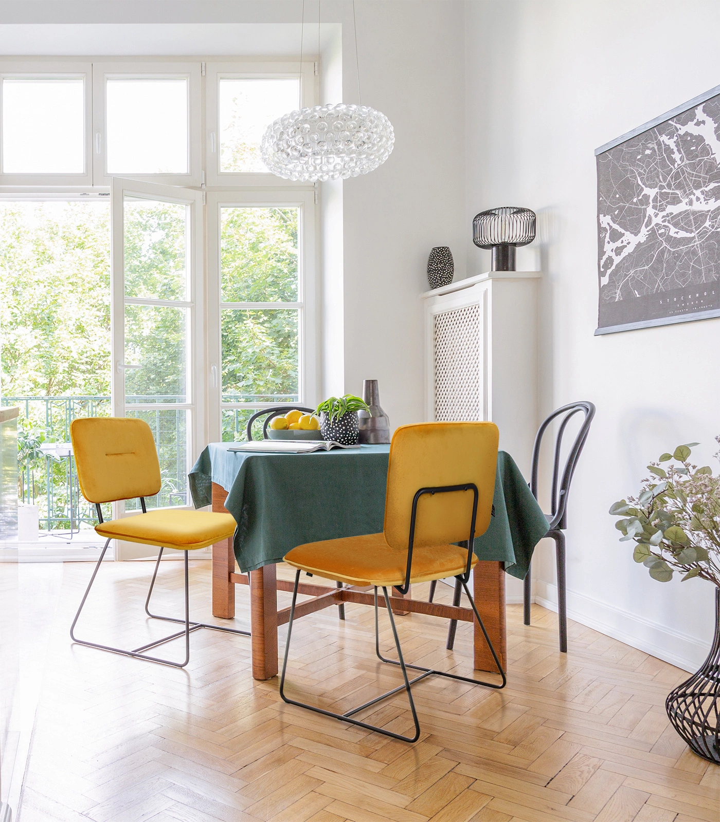 Minimalistický tvar a výrazné linie dělají ze židle Adele perfektní doplněk do interiérů v moderním nebo loftovém stylu. Charakteristické matně černé lyžiny podtrhují industriální vzhled nábytku, zatímco jemné prošívání na opěradle dodává židli elegantní nádech. Šedé sametové čalounění působí nejen stylově, ale zároveň přináší do prostoru útulnost a teplo domova.
