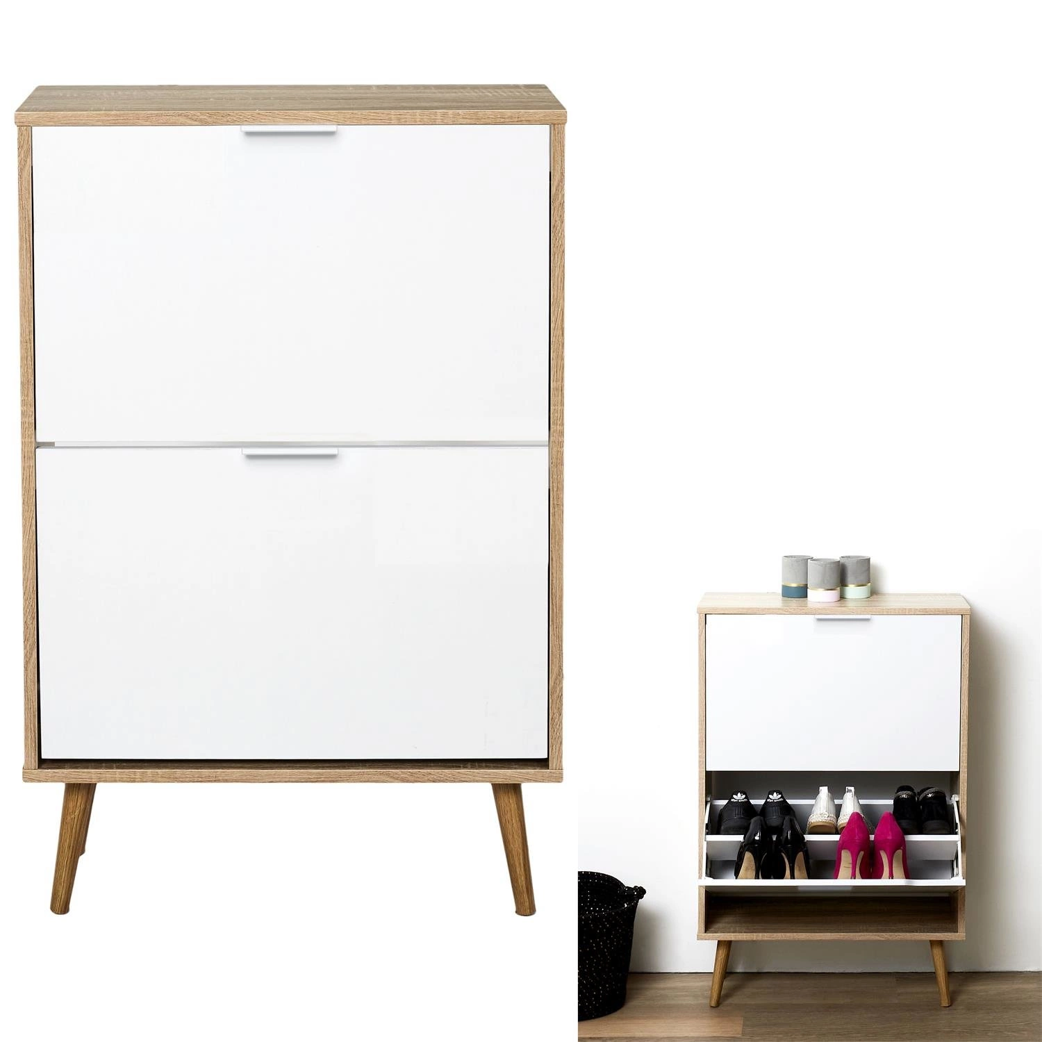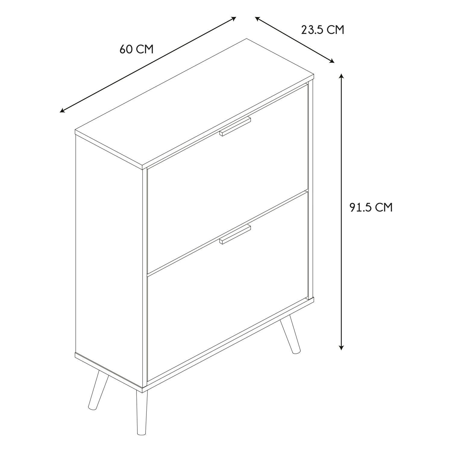 Mělký botník v bílé barvě s čely z dřevěné dýhy je dvoudveřový kus nábytku, který vám pomůže uspořádat obuv v předsíni. Skříňka s hloubkou 23,5 cm je ideálním kusem nábytku do malé předsíně. Skříňka má dvě výklopná čela. Na čela byly namontovány speciální police na boty. Skříň byla vyrobena z MDF desek, které jsou odolné a budou nám sloužit mnoho let. Bílý botník je ideálním kusem nábytku do světlé garsonky nebo interiéru ve skandinávském stylu.
